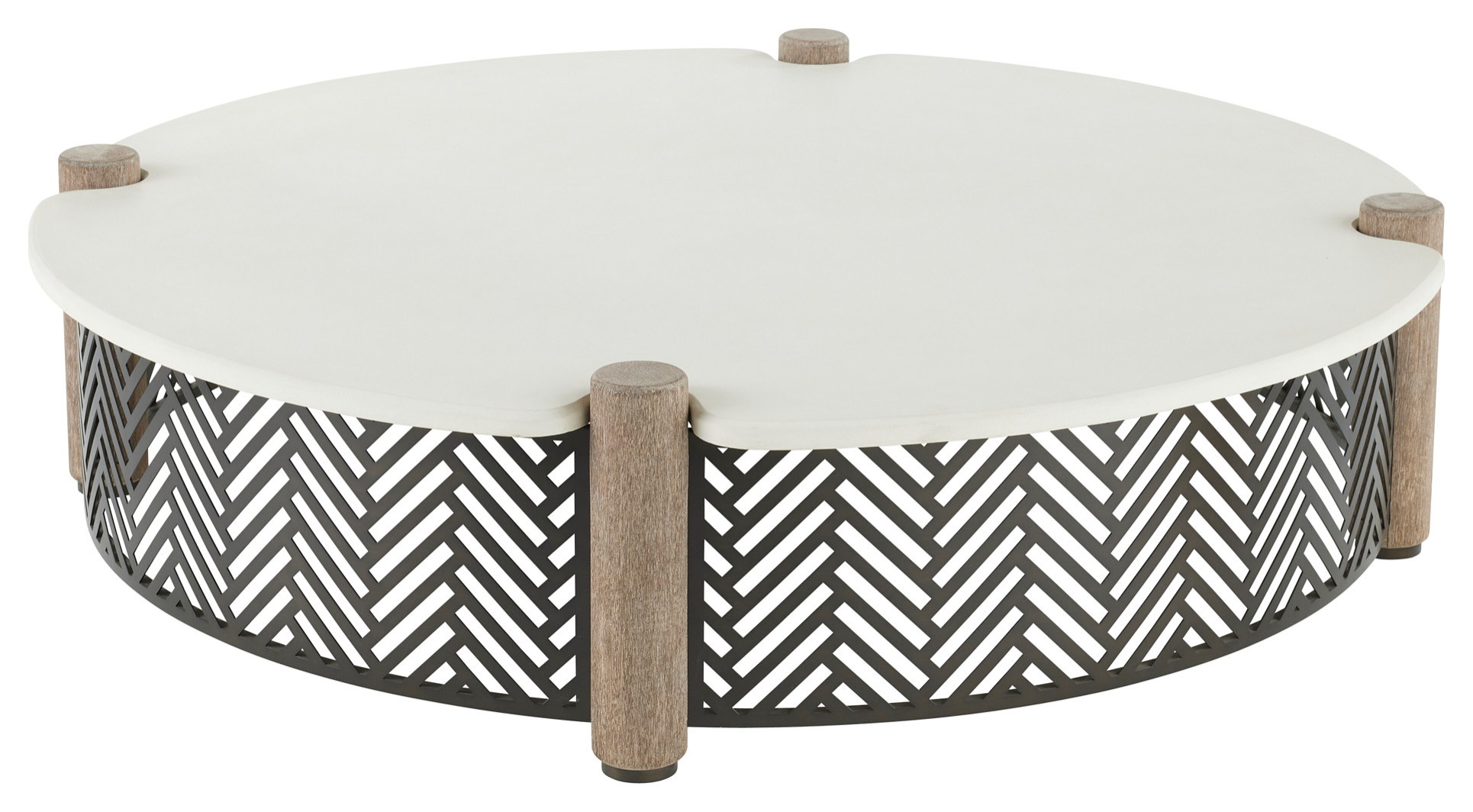 Many of the new outdoor collections presented at the market created visual interest with a mix of three or more materials and intricate details more often associated with indoor furniture. This Arteriors Emoto outdoor coffee table, for example, has a white concrete composite top, teak dowels and bronze-stainless steel metalwork in a herringbone pattern.