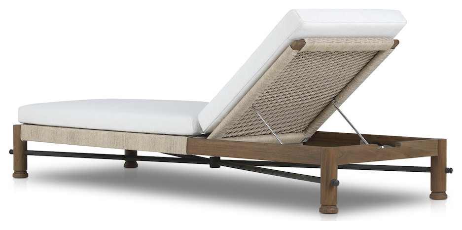 For example, the back of this weathered-teak Escape outdoor bench from Arteriors, which launched its first (gorgeous) outdoor collection at the market, has synthetic rope wrapped around its dowel back.