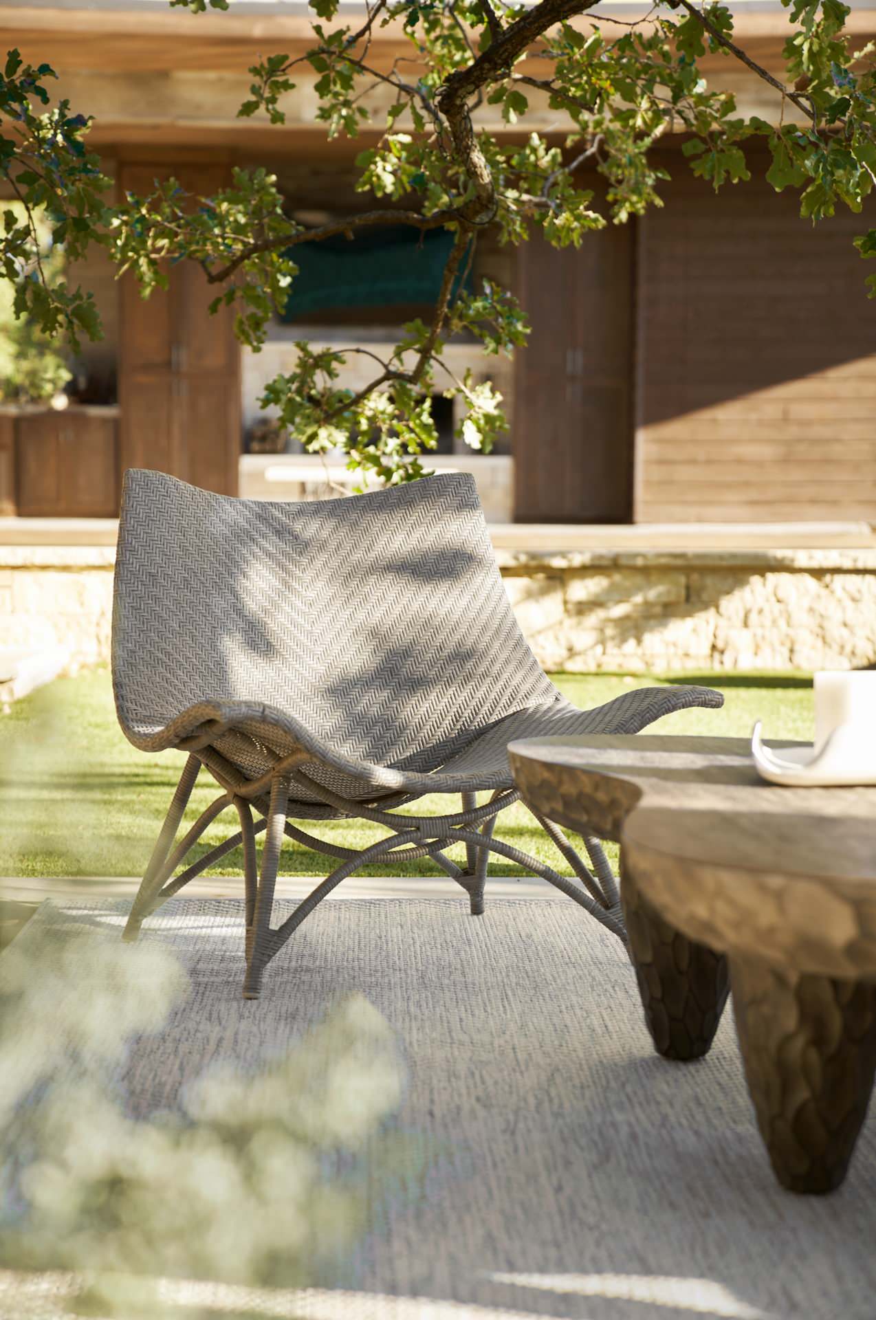 Another striking example was this Pacifica dining armchair by Summer Classics. It has a teak frame wrapped with vertical olefin rope.