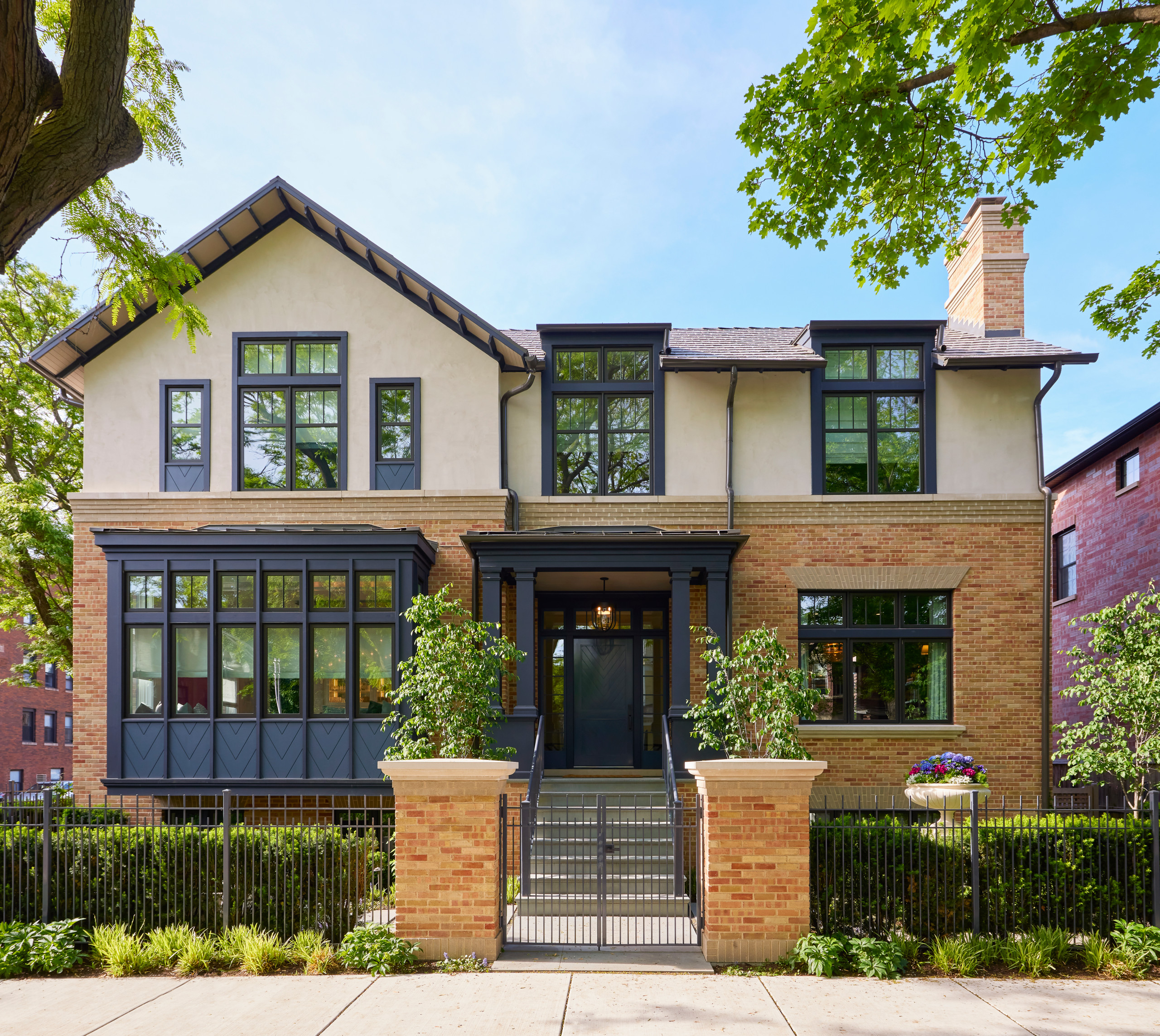 This Arts and Crafts-inspired Chicago home by BBA Architects features a black front door with sidelites and a transom window.