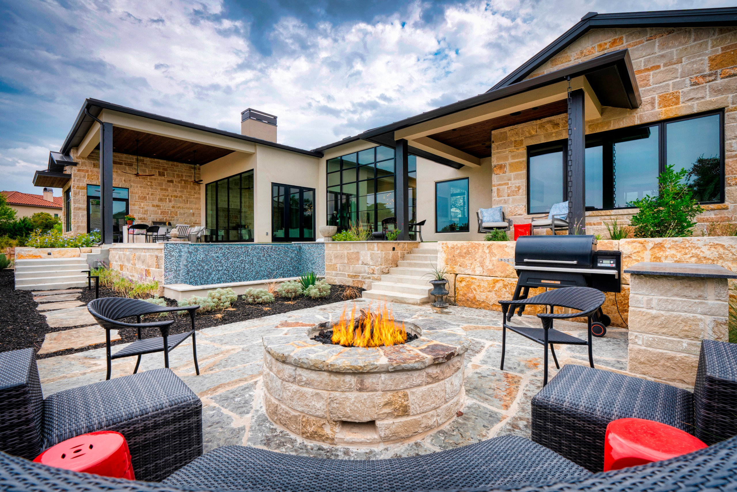This outdoor space in Boerne, Texas, has a welcoming patio lounge area surrounding a built-in fire pit. Nearby, a swimming pool feeds a blue-tiled waterfall.