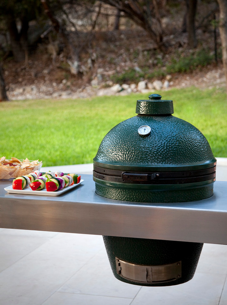 For clients in Texas, austin outdoor design used a minimalist mounting system for a Big Green Egg. The grill unit floats in a custom-made 14-foot-long stainless steel countertop. This allows for plenty of counter space and room below for bar seats.