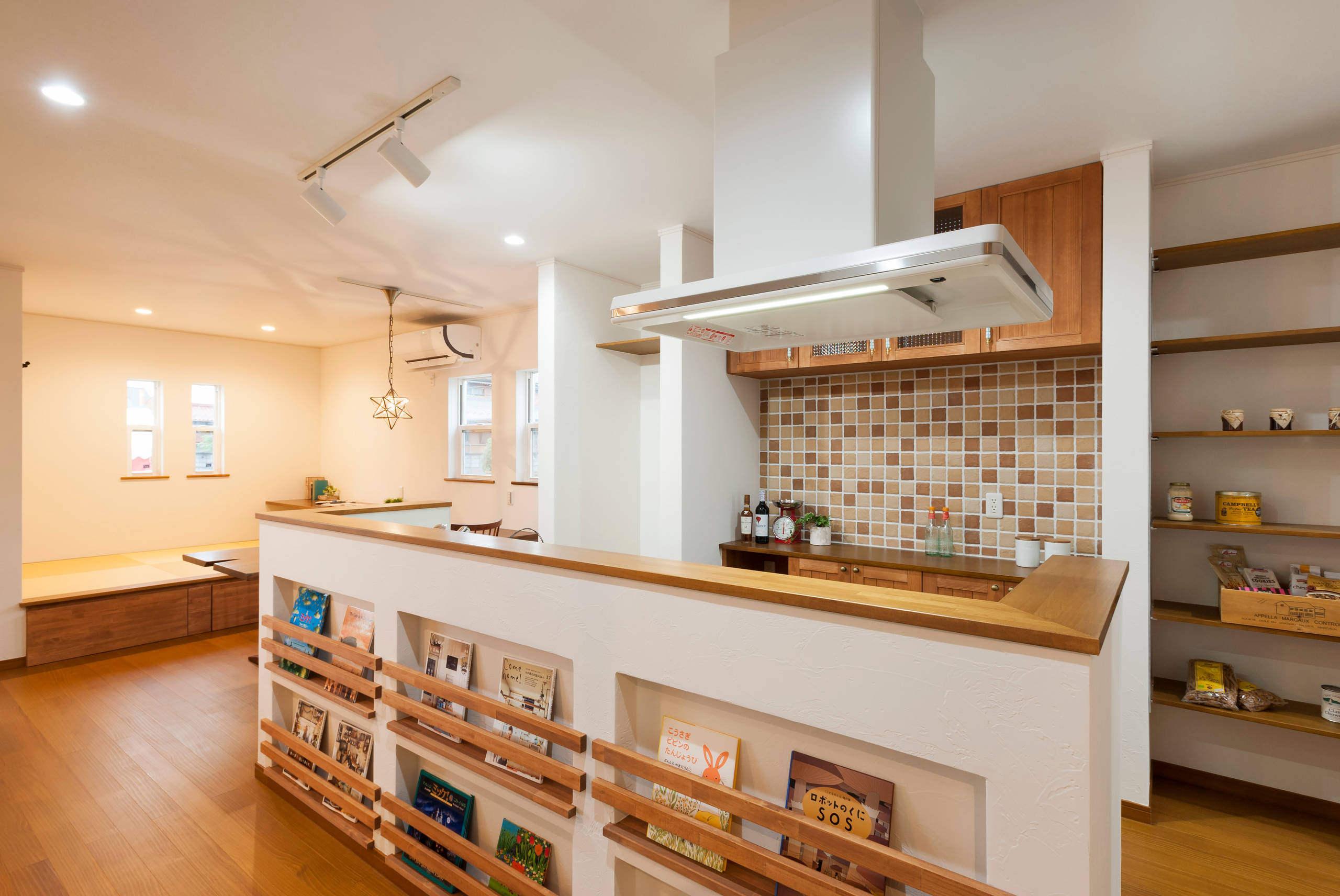 Book railings along an island make it easy for young children to choose a book and grab it themselves. A parent preparing dinner can keep a close eye on them and help with unfamiliar words while they read.