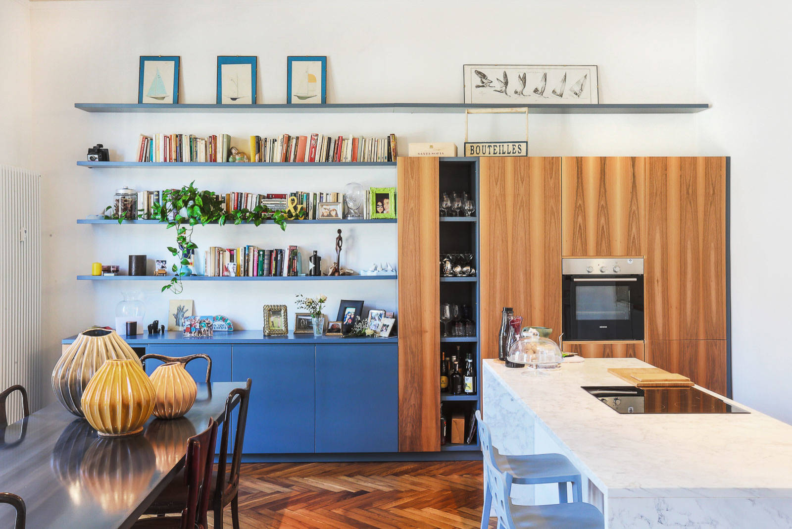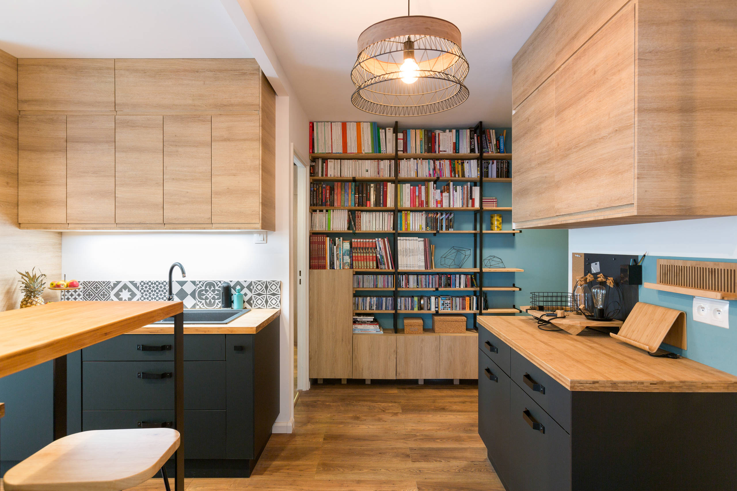 The wall in this kitchen is very yin and yang. The cabinets on the right provide an expanse of warm wood, while the blue lower cabinets and shelves full of books on the left show off a cheerfully colorful personal collection.