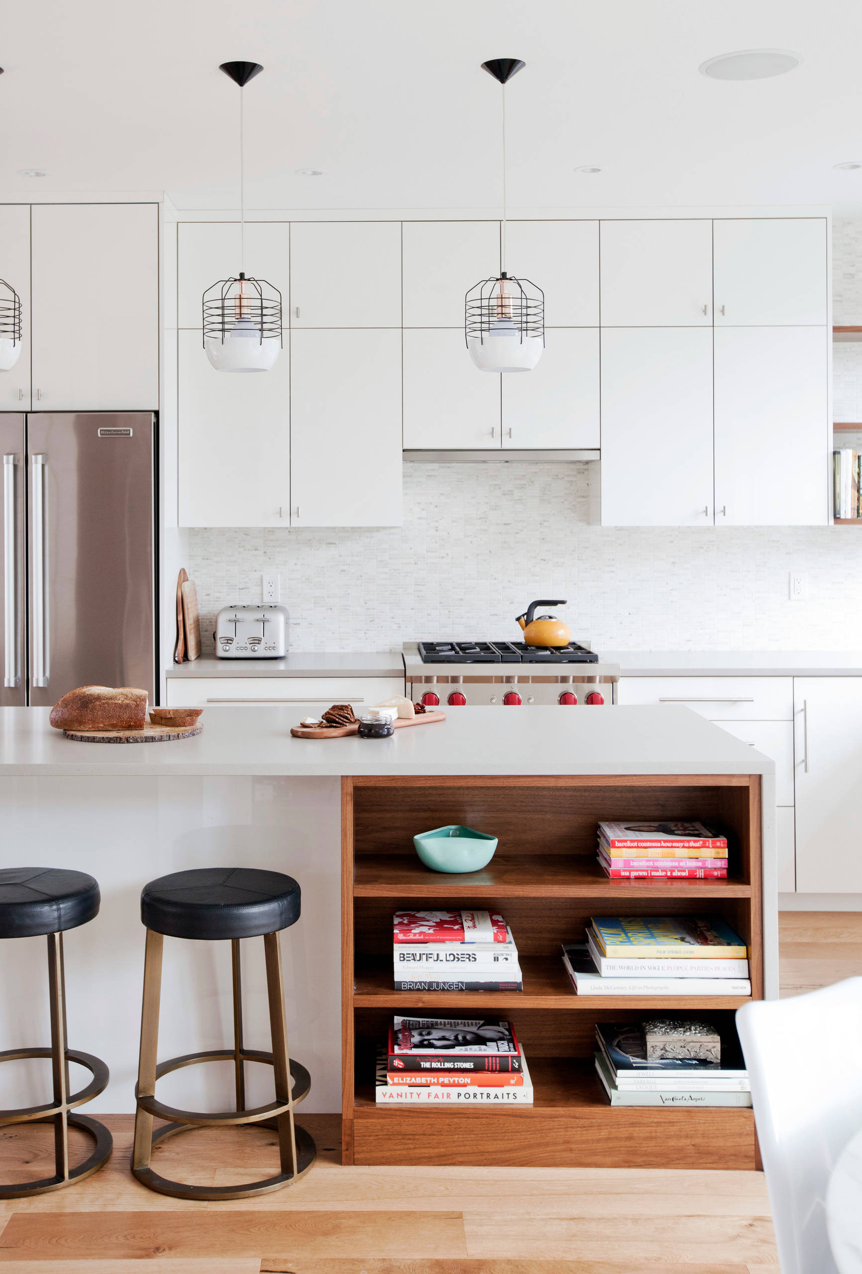 Big tomes full of beautiful photographs and artwork aren’t merely accessories for the coffee table; they are meant to be pored over and enjoyed. Placing them next to counter seating means that they can entertain your guests and spark conversation while you’re working in the kitchen.