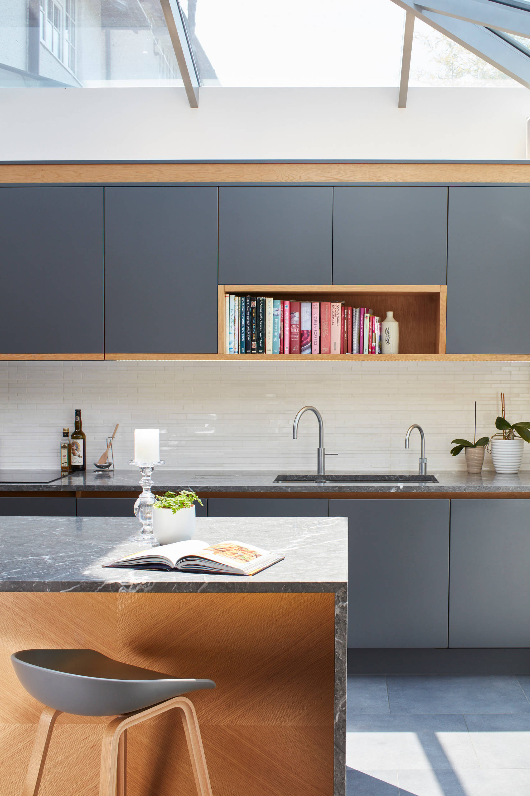 This clever book niche above the sink is an unexpected design element in the contemporary kitchen. It also makes it very easy to grab some culinary help from Edna Lewis, Alice Waters or Julia Child.