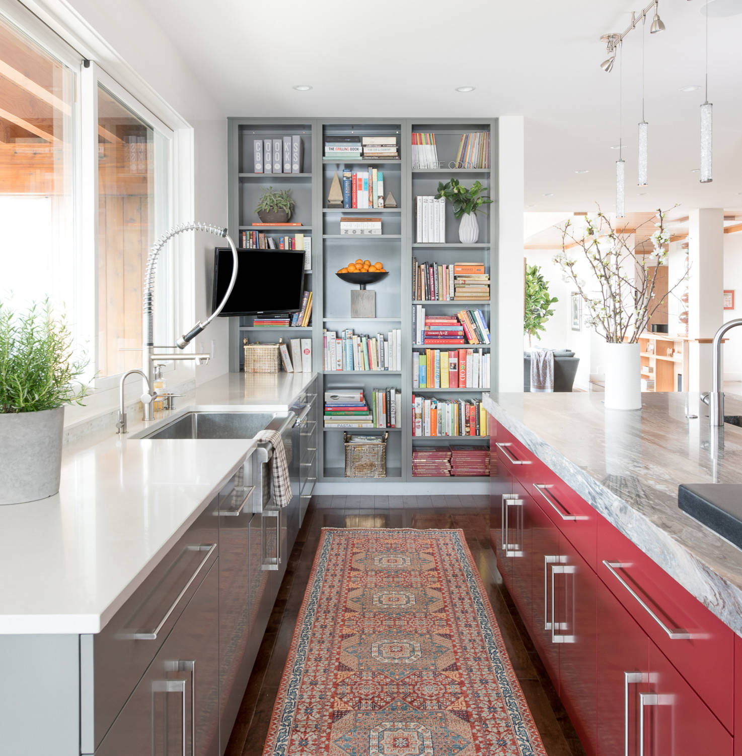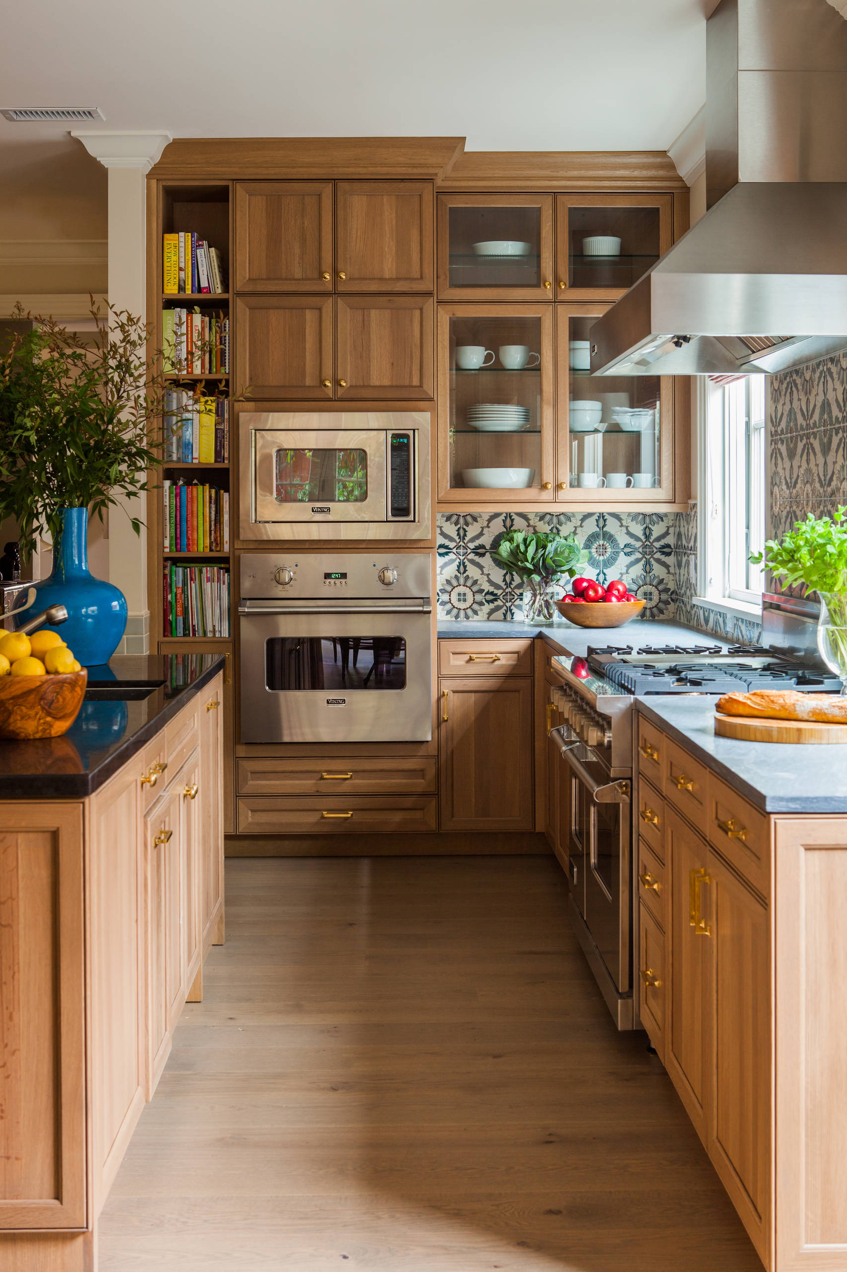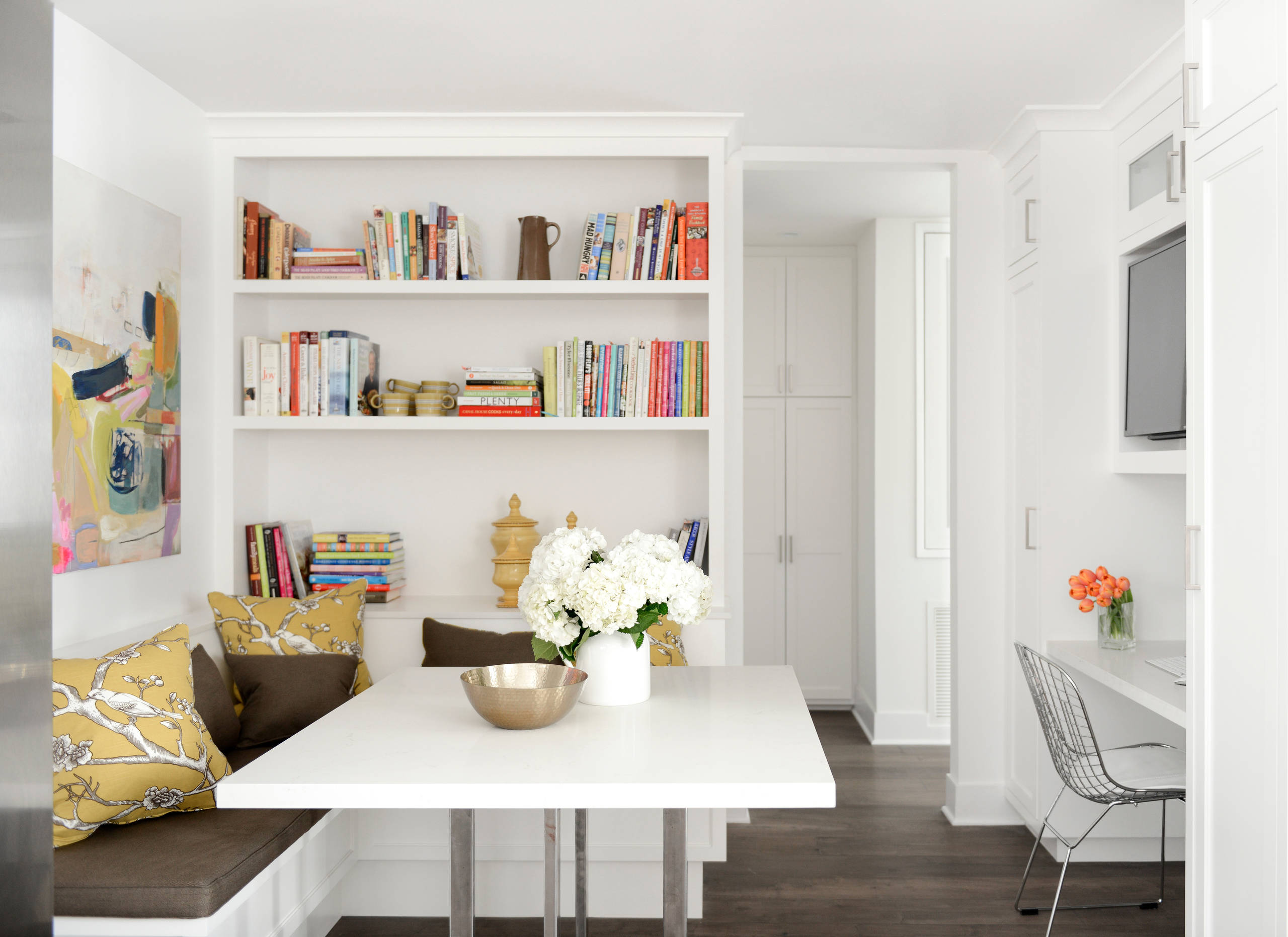 “I always design a place for old friends in the kitchen … both to gather together in person and with the ones I find in great books,” says designer and renovator Laura Schwartz-Muller. In this California kitchen, the book spines in the wide, built-in bookshelf add color and a selection of literary friends to choose from when the homeowners want to settle into the banquette with a good book.
