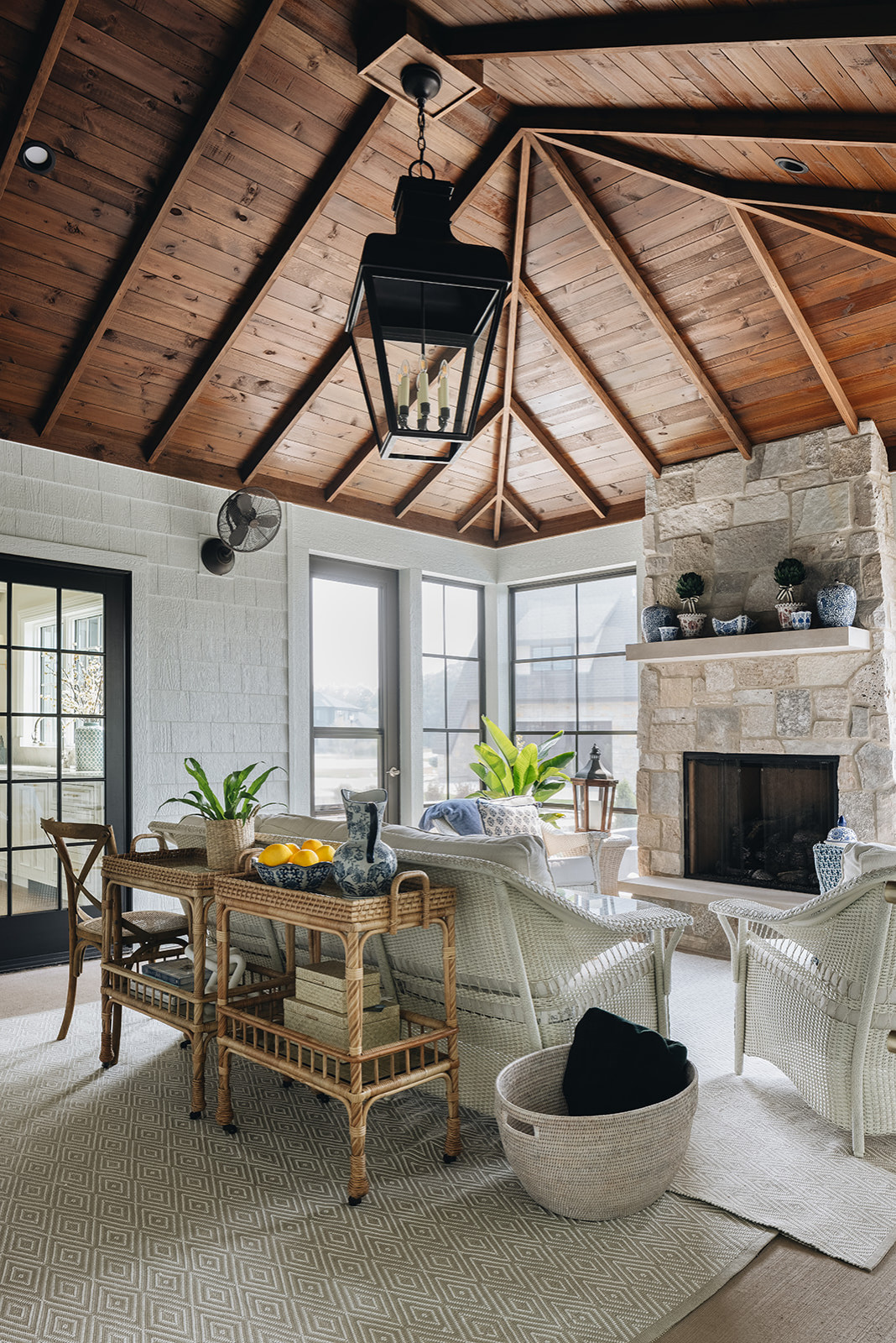 Two styles meet in this lovely Wisconsin porch by Keuler Construction. From the floor to where the walls meet the ceiling, there’s a light and breezy coastal feeling. Overhead, the stained wood paneling and oversize lantern bring in a cozy cabin feeling. The lovely fieldstone on the fireplace lands somewhere in the middle, tying the two styles together.