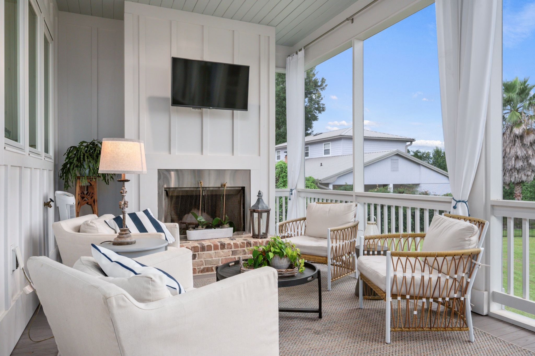Rugged stones and warming wood aren’t really the right fit for South Florida. Instead, Bob Chatham Custom Home Design gave this Miami screened-in porch cooler vibes. A white board-and-batten fireplace surround, white upholstery and breezy curtains suit the coastal cottage. Steel around the firebox also adds a cooler feel, while a brick hearth brings in a traditional touch that goes with the home’s architecture.