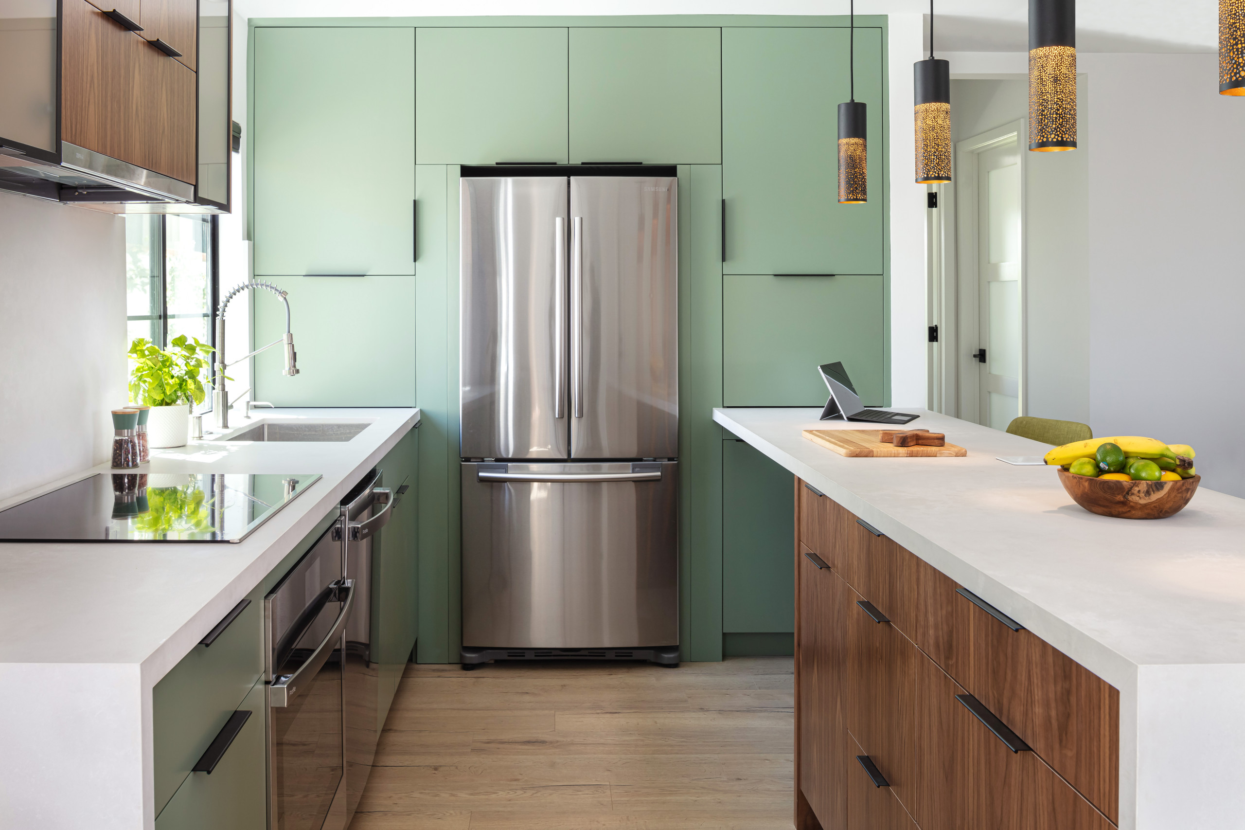 Use every spare inch in a small kitchen by building recessed shelves where feasible. Here, they surround an integrated refrigerator. With this design solution, wall space that’s too skinny or awkwardly shaped for extra cabinets can still be used to hold frequently used items. In this kitchen, it also helps open up the room and leads the eye to an appealing feature.