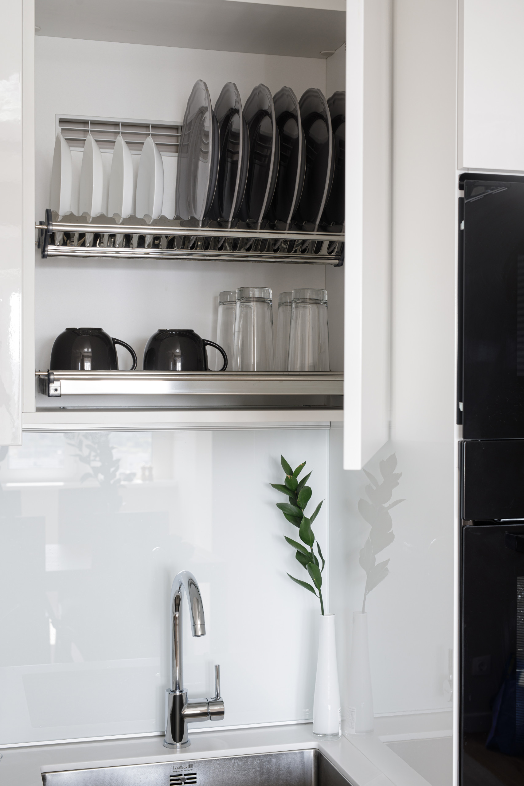 It may sound like a no-brainer, but often what makes a kitchen, big or small, organized is how we arrange the insides of our cupboards. Shelf and drawer dividers, hooks, racks and other storage devices are key to keeping order. Consider what works for you and go custom if you can. Are you a Mason jar and Tupperware kind of person? Do you prefer mugs on hooks, shelves or in drawers? Storage is often about personal preference. Here, the slim slots for chopping boards and placemats are a brilliant idea, as is the slim pullout spice rack.