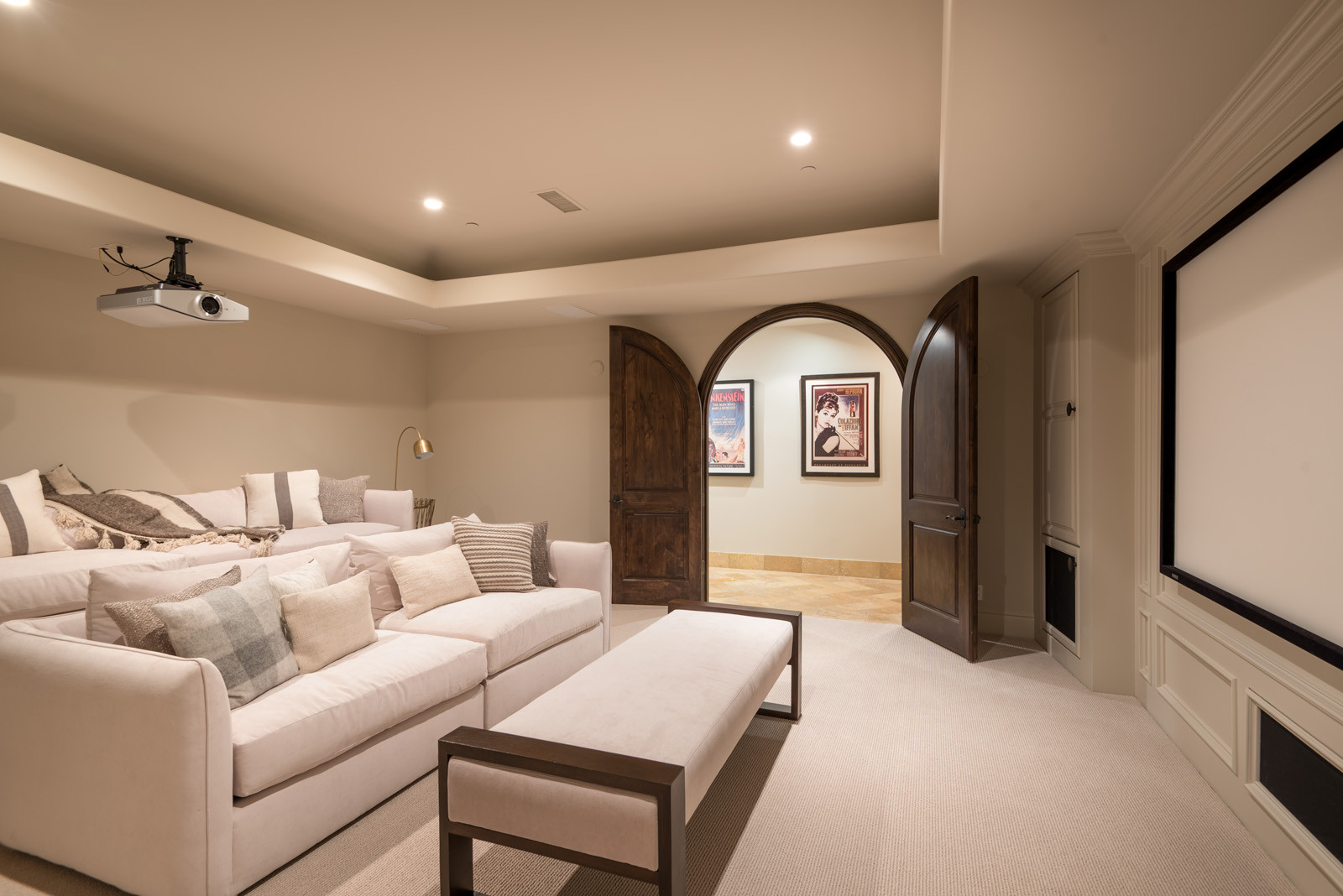 A large projector and screen create an immersive cinematic experience, while swivel chairs and a cream sectional upholstered in a neutral performance fabric give the homeowners comfortable seating options. Ample walk space behind the furniture minimizes disruptions and obstructed views.