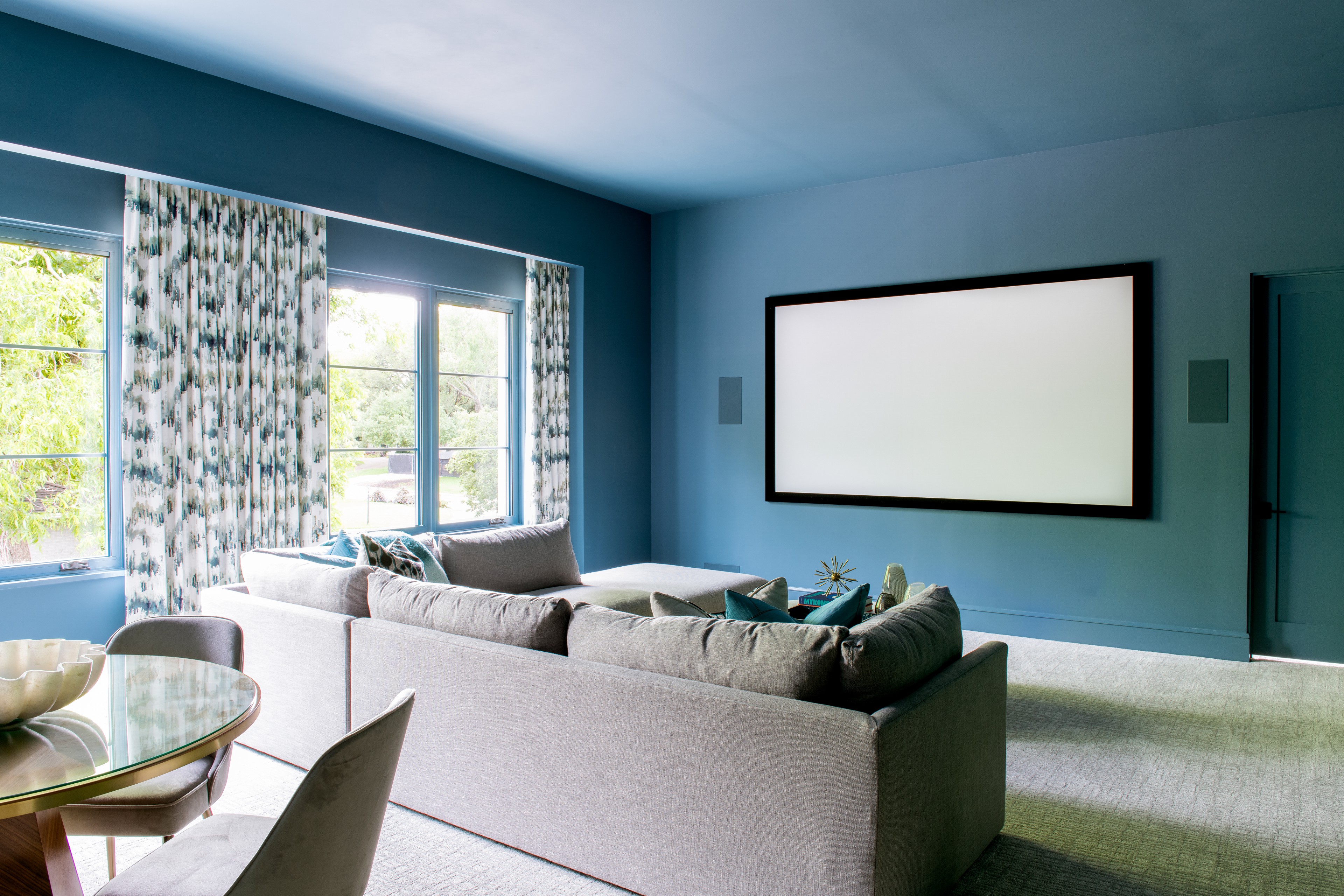 Beautiful, calming blues cover the walls in this Texas home theater by Symmetry Architects. This vibrant matte hue can handle sunlight and darkness equally well. Beige and gray carpeting balances the expanse of color with neutral tones.