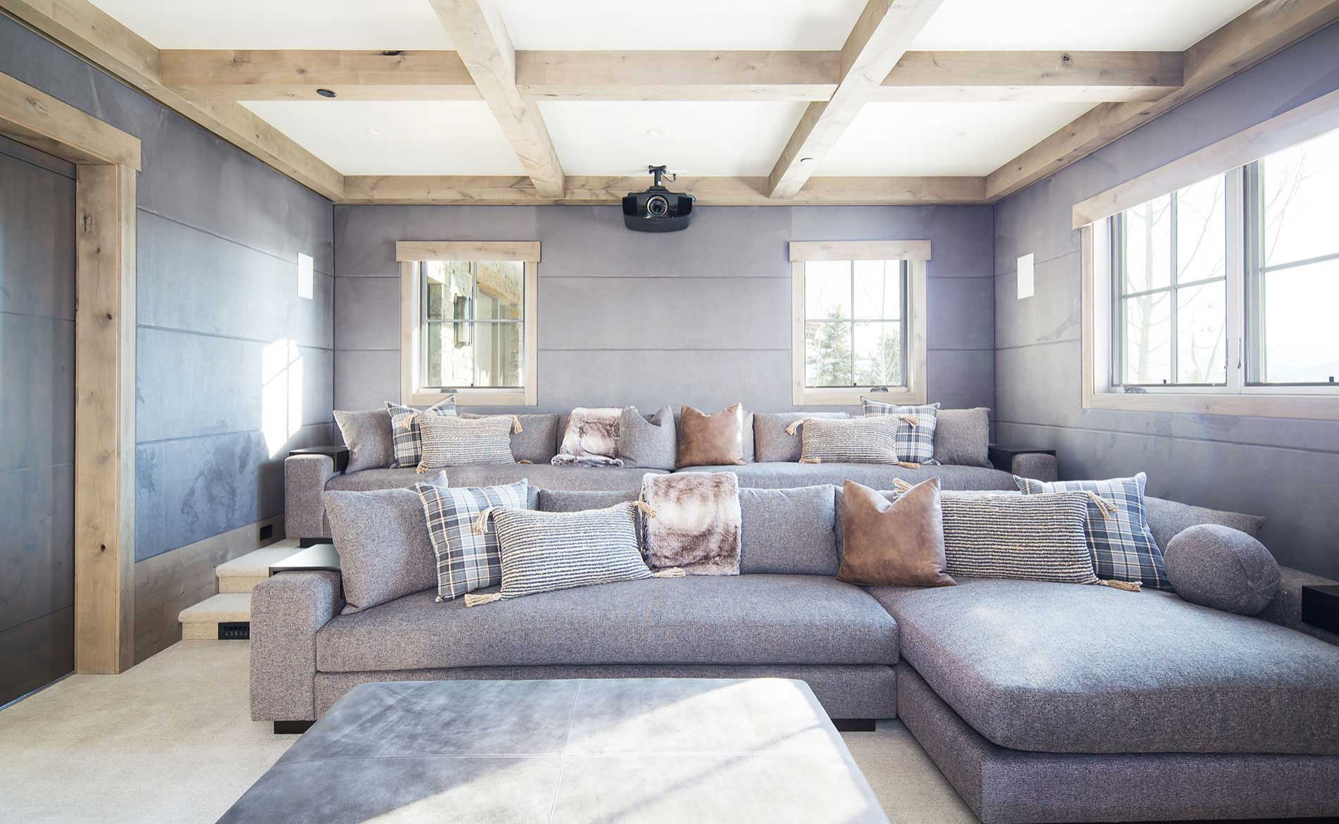 In this mountain-modern home theater in Teton Village, Wyoming, Katie Merritt of KAM Designs used upper and lower decks with large gray sofas to create stadium seating with clear views of the screen. Safety lights on the stairs leading to the top level turn on when the room is dark. Motorized blackout shades, dimmable lighting and a projector managed by a high-tech control system make it easy to turn off the lights and press Play.