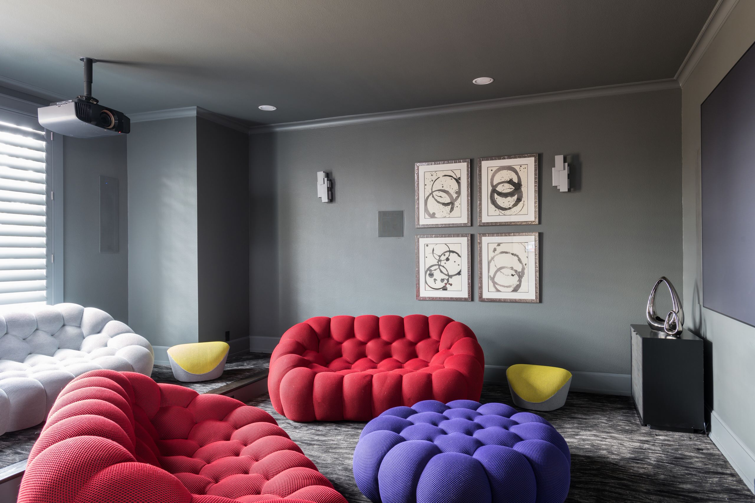 Traci Connell Interiors and the owners of this Dallas home searched Houzz for inspiration to make a playful and sophisticated modern theater room. The result is this split-level steel gray room with bright red, purple, yellow and white bubble seating and accents. The abstract placement of the low sofas makes them easy to move around the space for better viewing angles of the screen or to engage in conversation. Walls with extra insulation and sculptural art throughout dampen echos and help contain noise.