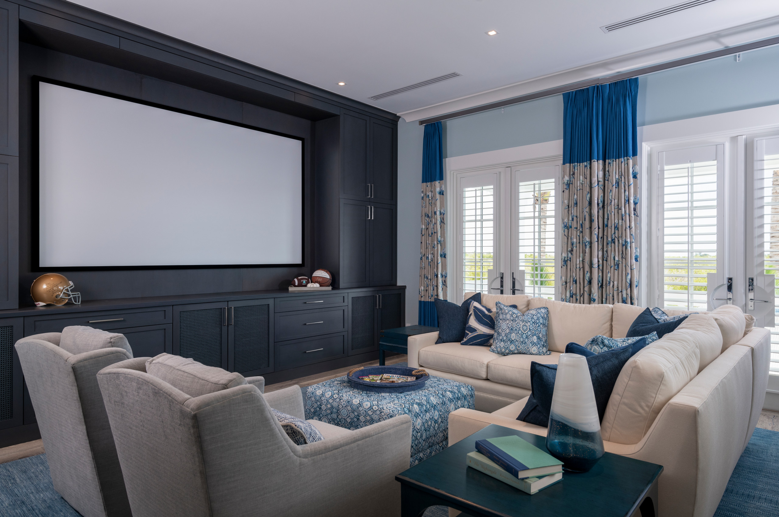 Jinx McDonald Interior Designs used plantation shutters and blue-and-beige draperies with blackout linings to darken this bright coastal-style home theater in Fort Myers, Florida.