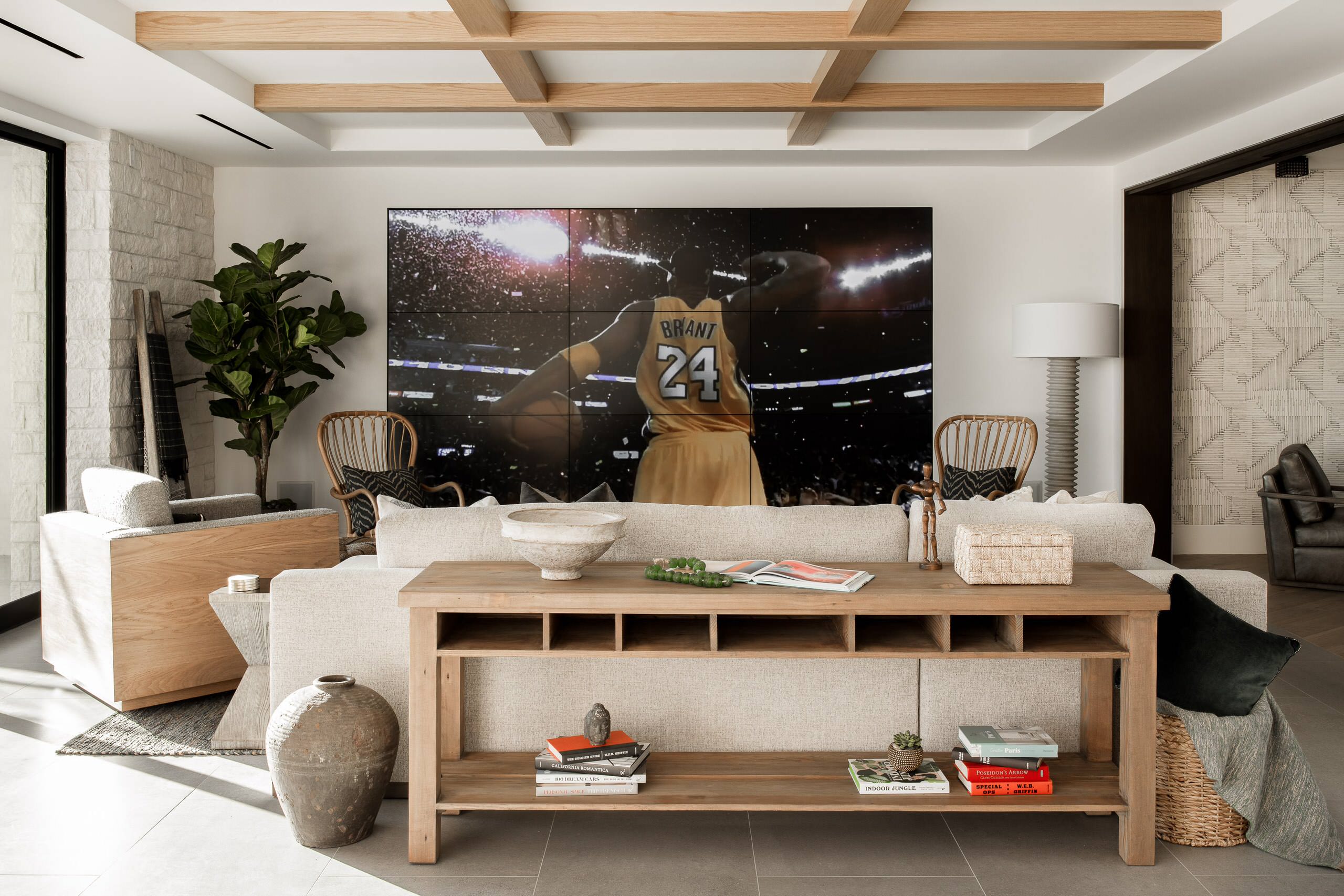 A tall ribbed floor lamp near the large cased opening can give the room a warm glow when needed. And glass doors that let in outside light can be easily covered to darken the room for an immersive experience. Neutral walls and floors, along with textured white oak furniture and ceramics, strike a relaxed tone in this nontraditional theater room.