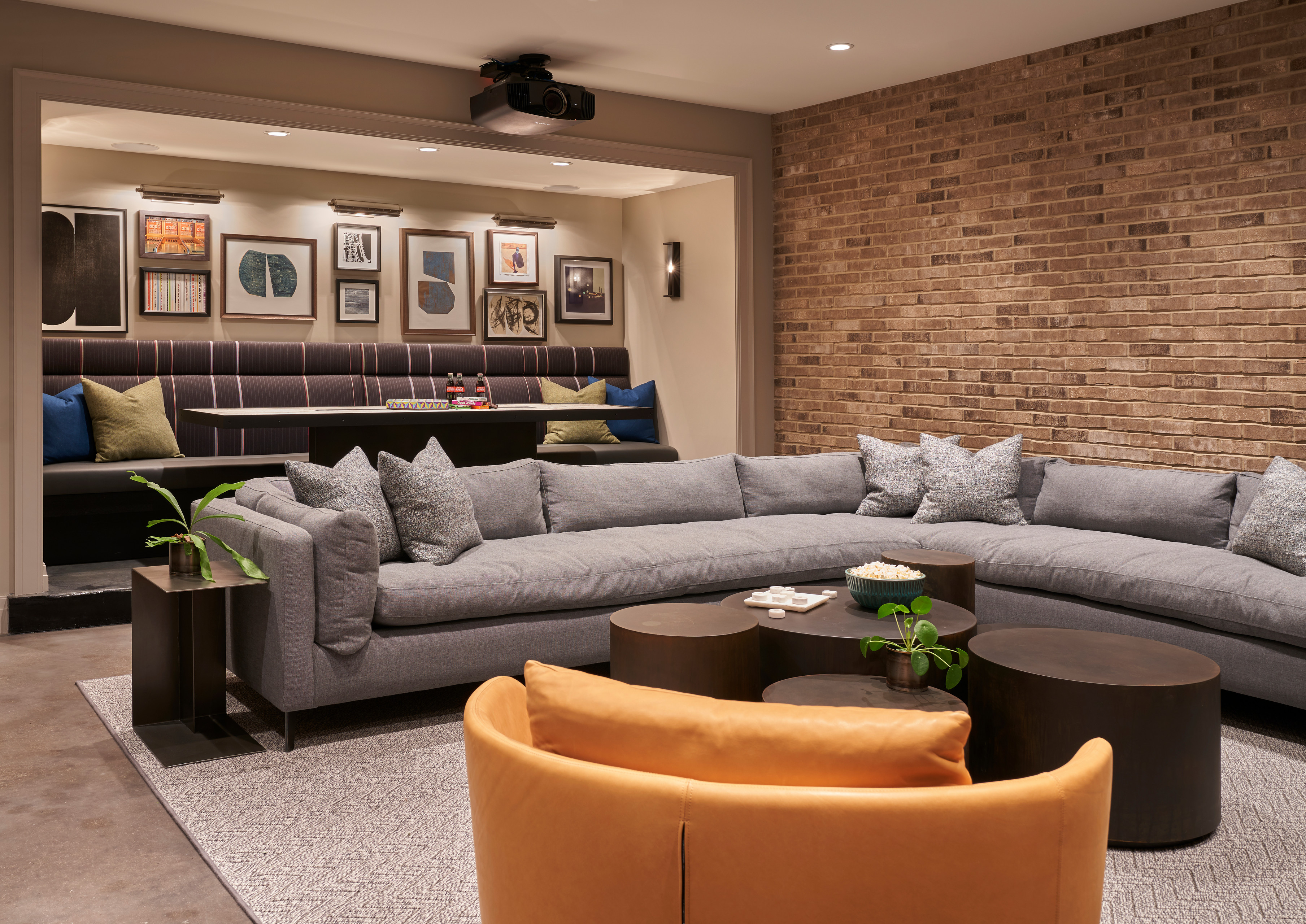 An overhead projector for watching movies and shows on the big screen hangs at the opening of an elevated cutout area at the back of the room, with restaurant-style wall bench seating and a wide table for dining, playing board games and having conversations. Recessed lighting and wall sconces illuminate a wide gallery wall of framed art and keep light in the rear from interrupting the movie playing up front.