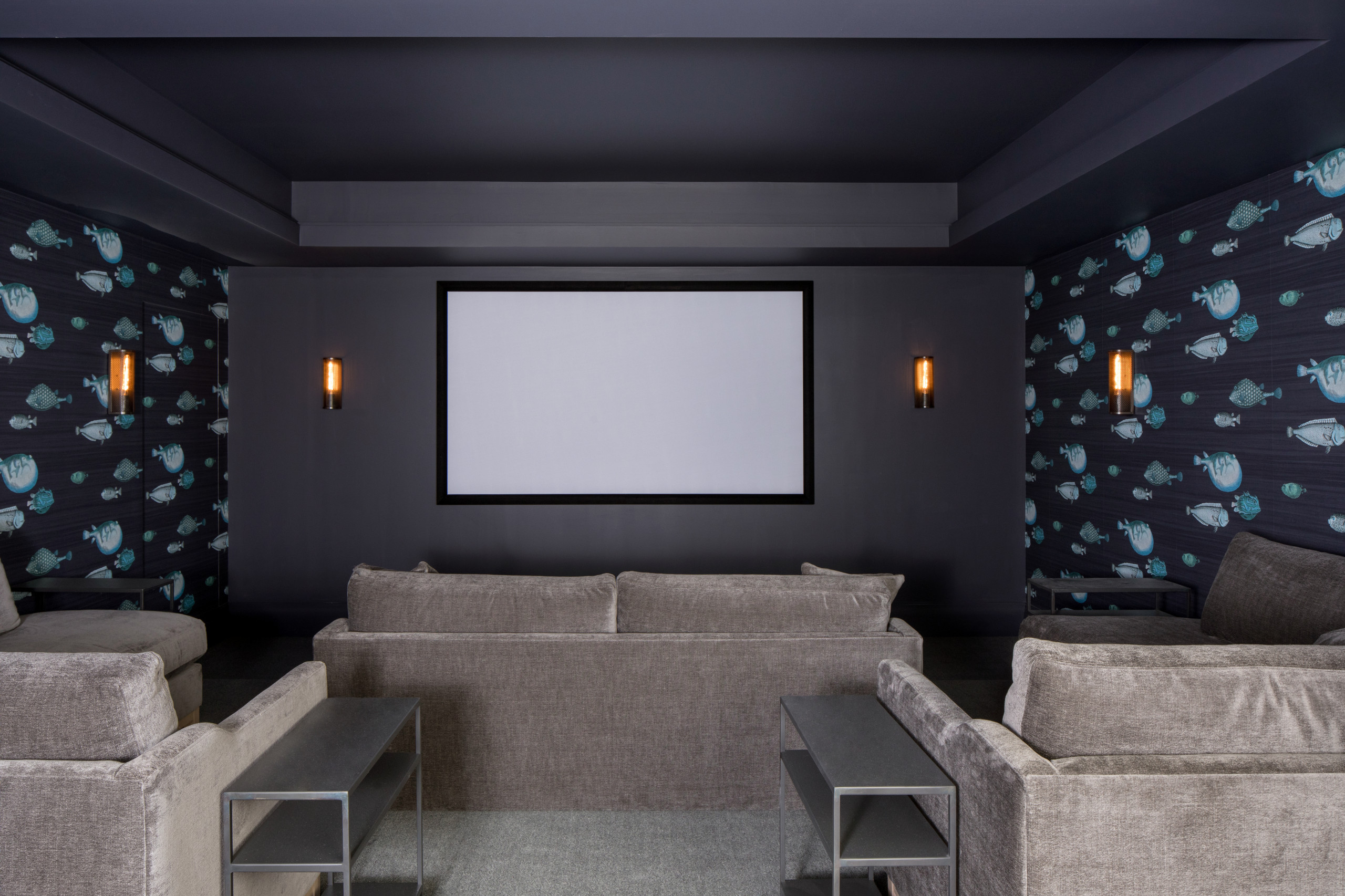 Two L-shaped velvet sectionals, edged by metal side tables for drinks and snacks, lead to a lower-level love seat that’s front row center. A fun fishy wallpaper clads a portion of the walls and adds a bit of whimsy to this dark basement theater.