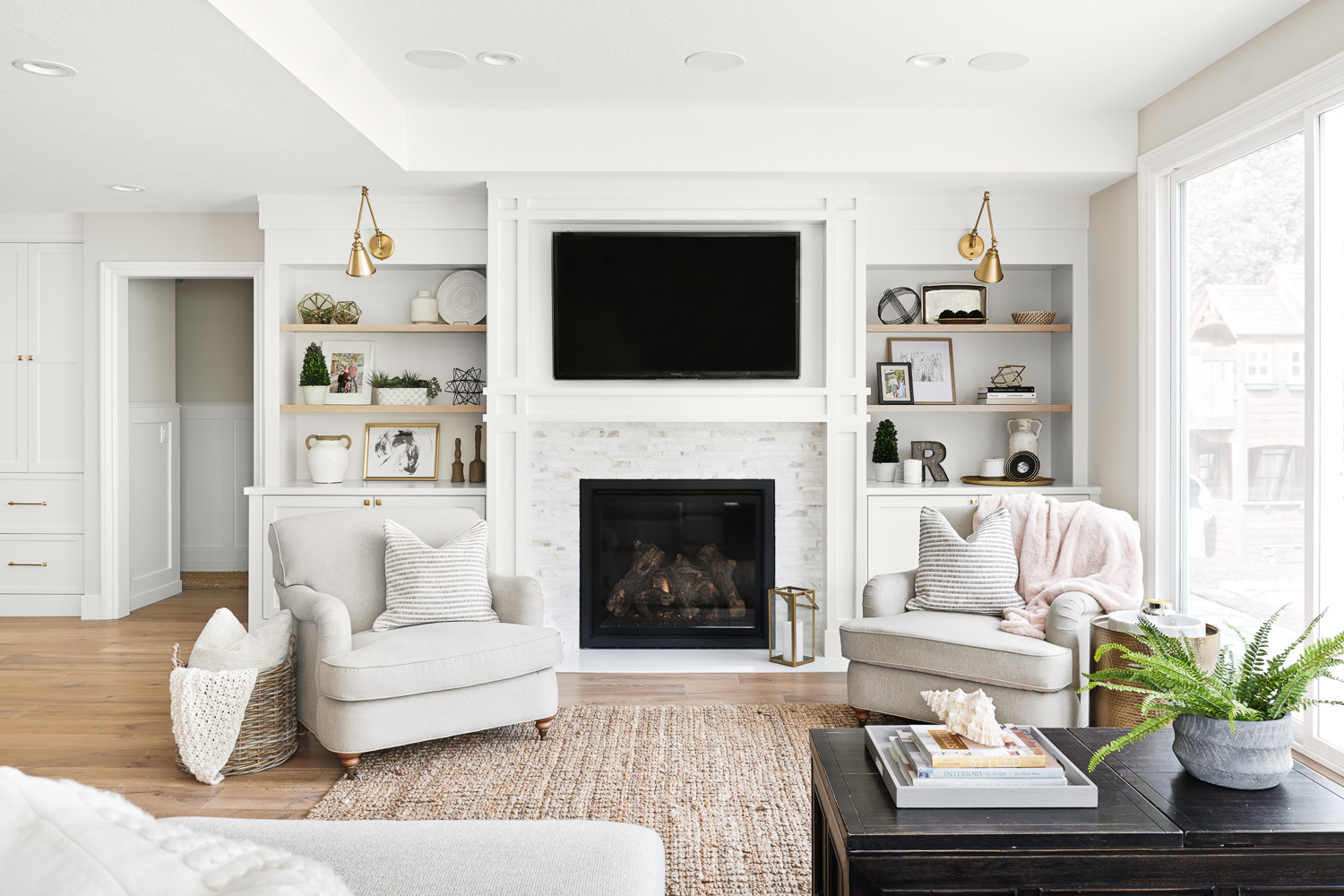 Similarly, in this Atlanta living room by Bradford Custom Homes & Remodeling, bright white walls and a cathedral ceiling enhance the natural light. A pair of light gray armchairs, a gray sofa and a rug with beige and gray tones create layers of light neutrals. The firm won a Best of Houzz Design award for the space.