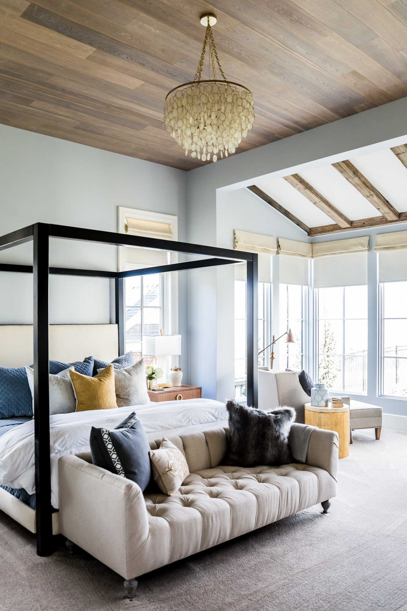 A pronounced black frame on this canopy bed in a Salt Lake City room by Liv Design Collective adds bold lines that create drama and tension in the otherwise soft and calm space. The bedroom earned the firm a Best of Houzz Design award.