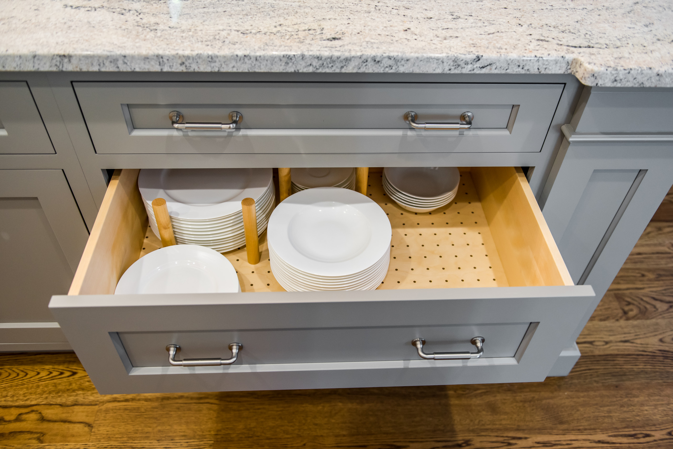 A pegboard with adjustable pegs at the bottom of a drawer, like this one by Apple Wood Construction, makes it easy to keep items organized and in place.