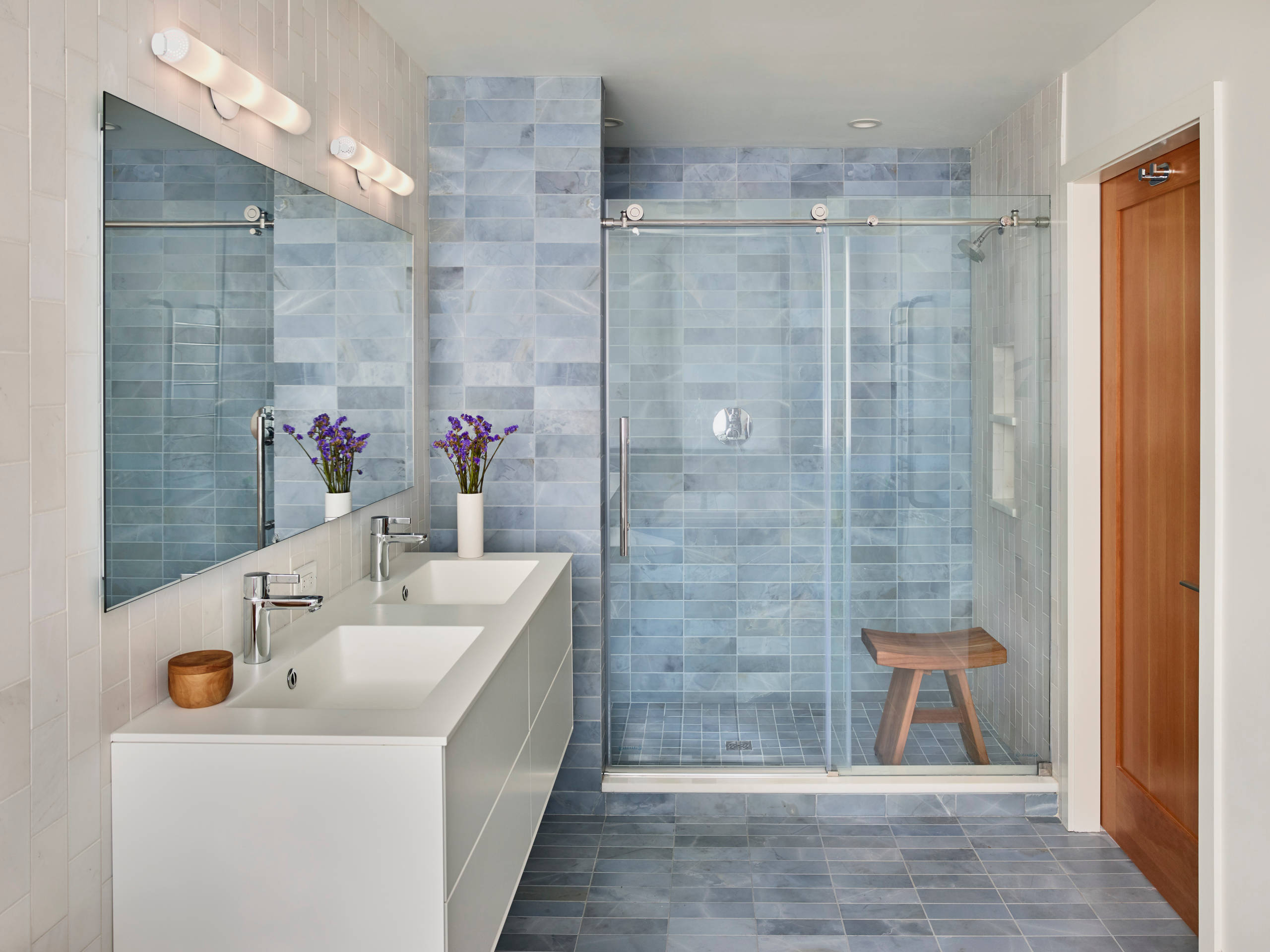 There are two options for shower heads: ceiling-mounted or wall-mounted. Wall-mounted shower heads are typically installed at 80 inches above the finished floor. Ceiling-mounted, or rain-style, shower heads are generally more expensive and require additional plumbing. Some people love rain-style shower heads for the soothing patter of water; others feel the pressure isn’t always strong enough to wash hair products out. Some people like having both options, as was done in the bathroom shown here.