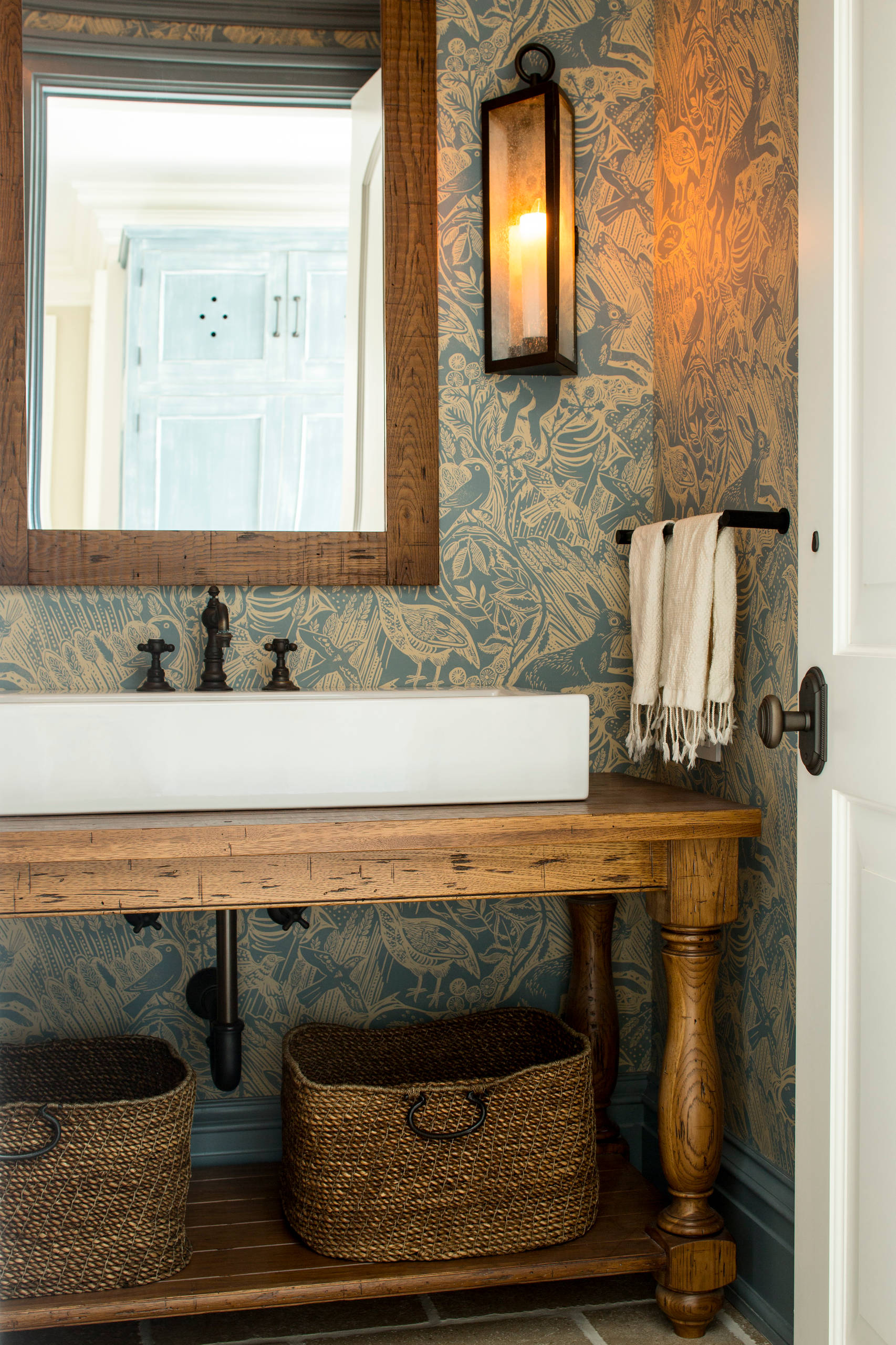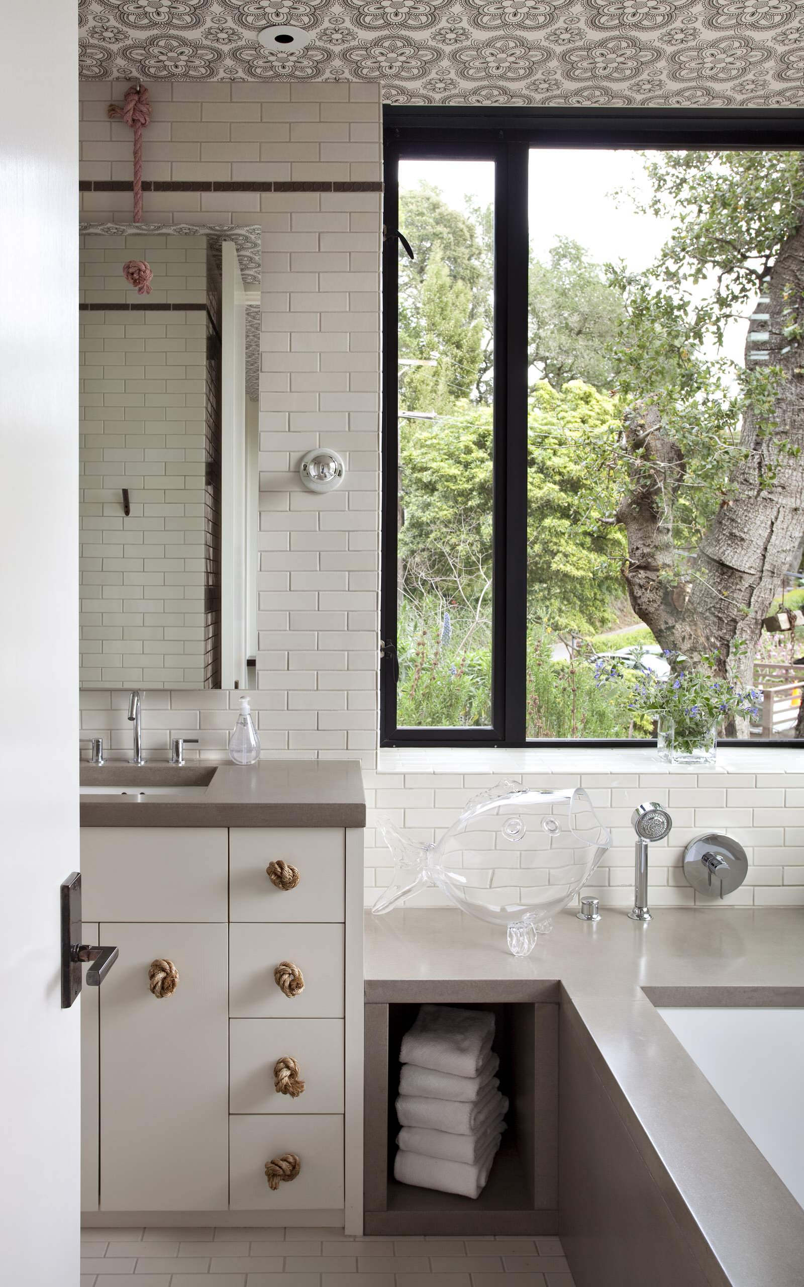 If you can’t find the right spot to add drama, try looking up. A single roll of wallpaper is often enough to make over a bathroom ceiling, and since bathrooms are often taller than they are wide, adding a little interest overhead will only help make the room feel intimate and more well-proportioned.