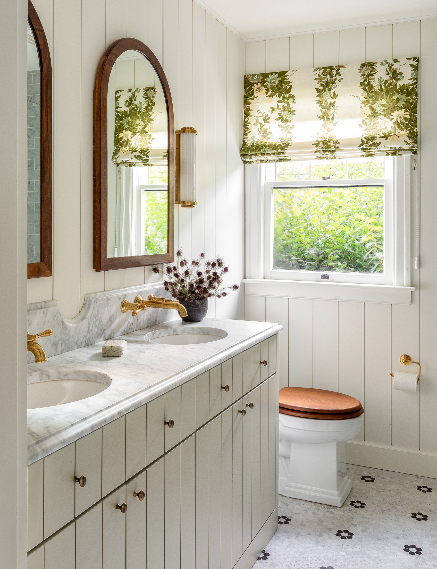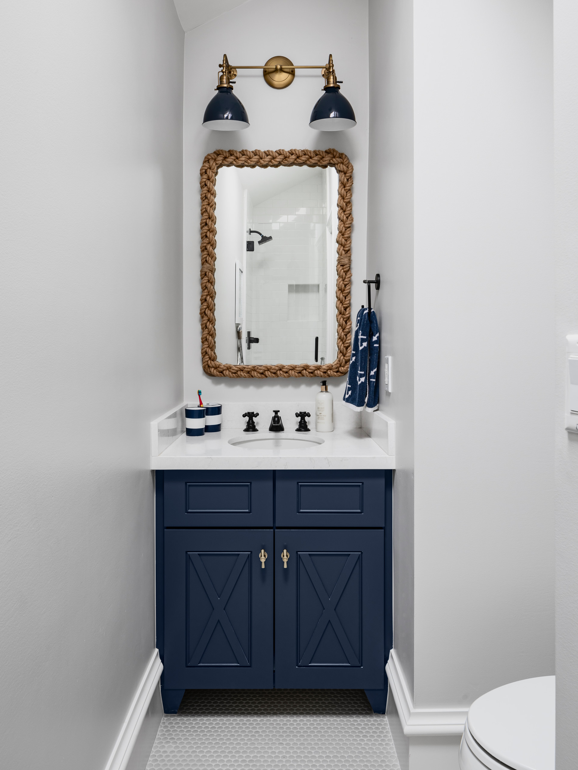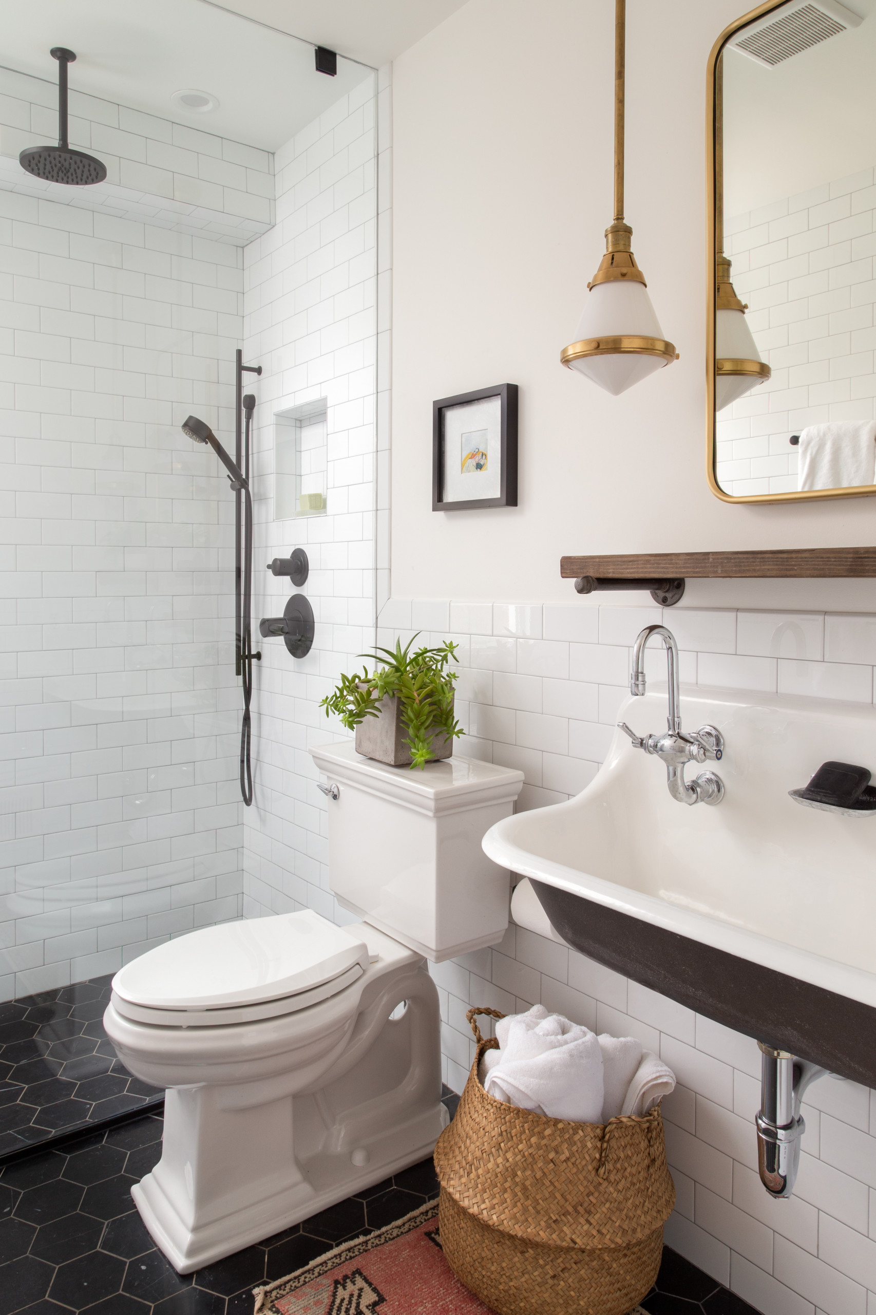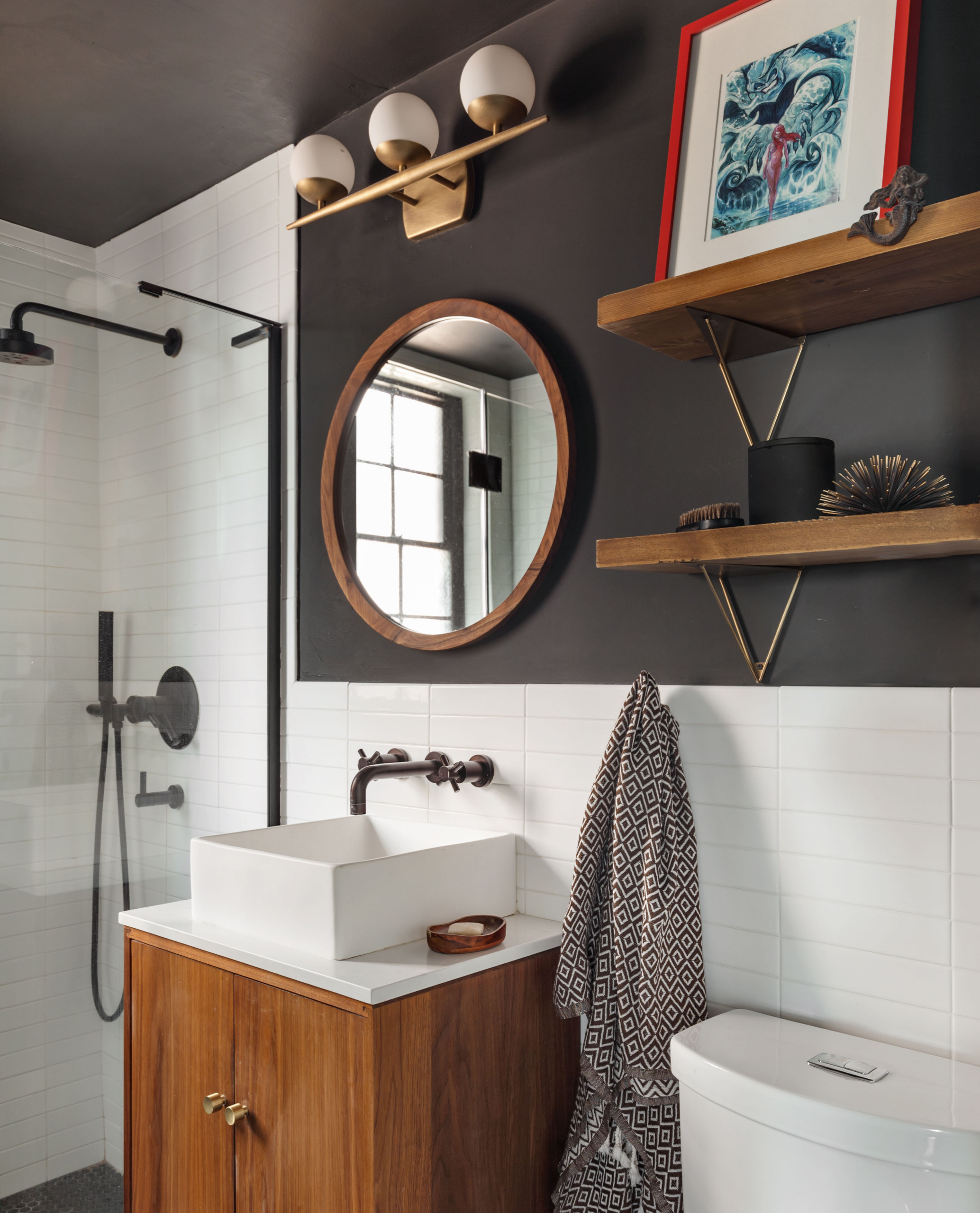 Having lighter colors at the eyeline will help a bathroom feel clean and airy, but try balancing them with a deep color lower to the ground. This adds a sense of richness that helps keep the space from feeling too stark, without making it overwhelmingly dark. Plus, it beautifully sets off classic white fixtures.