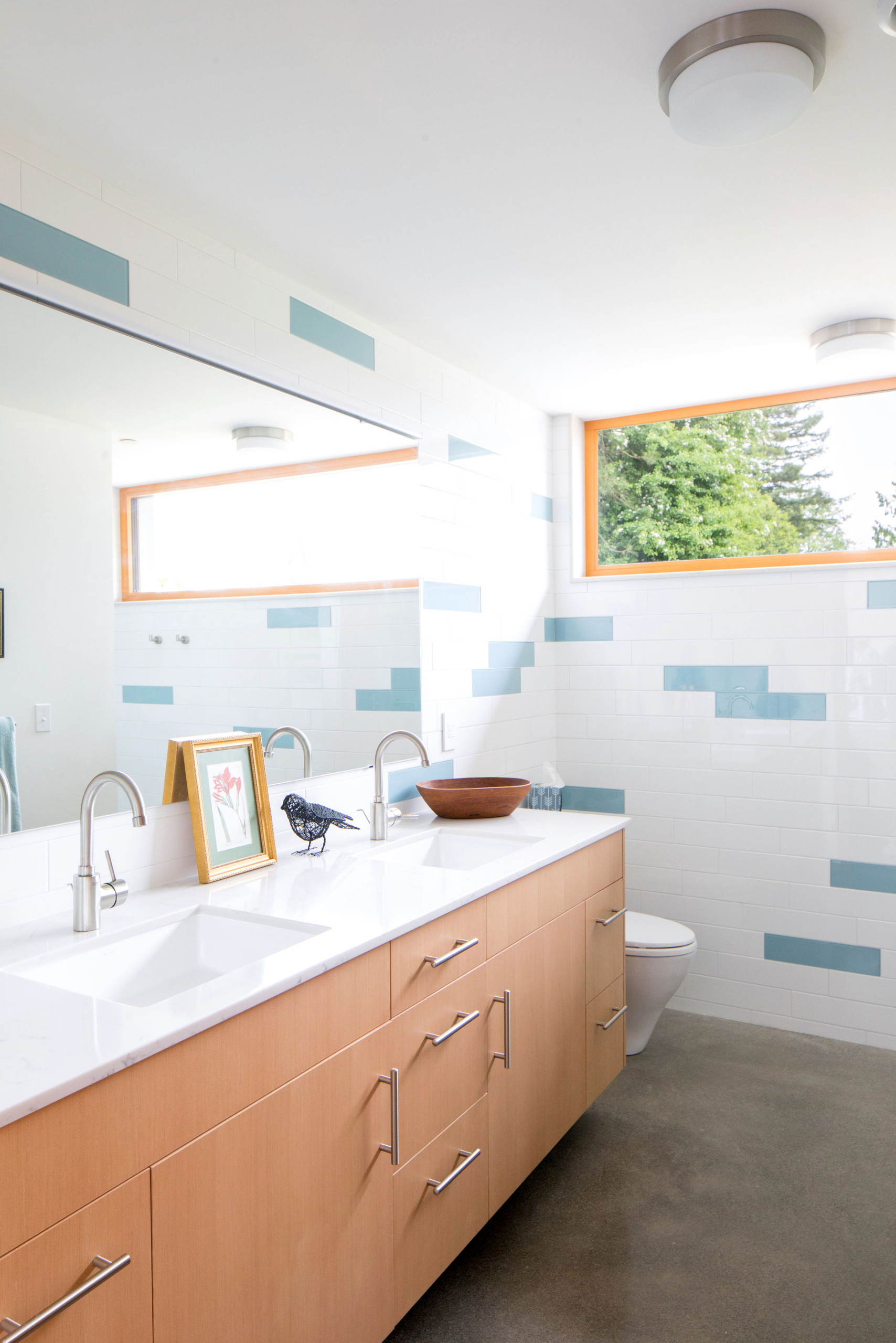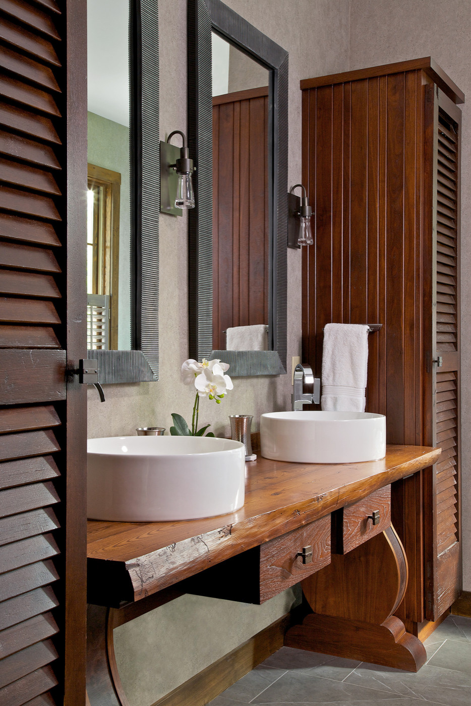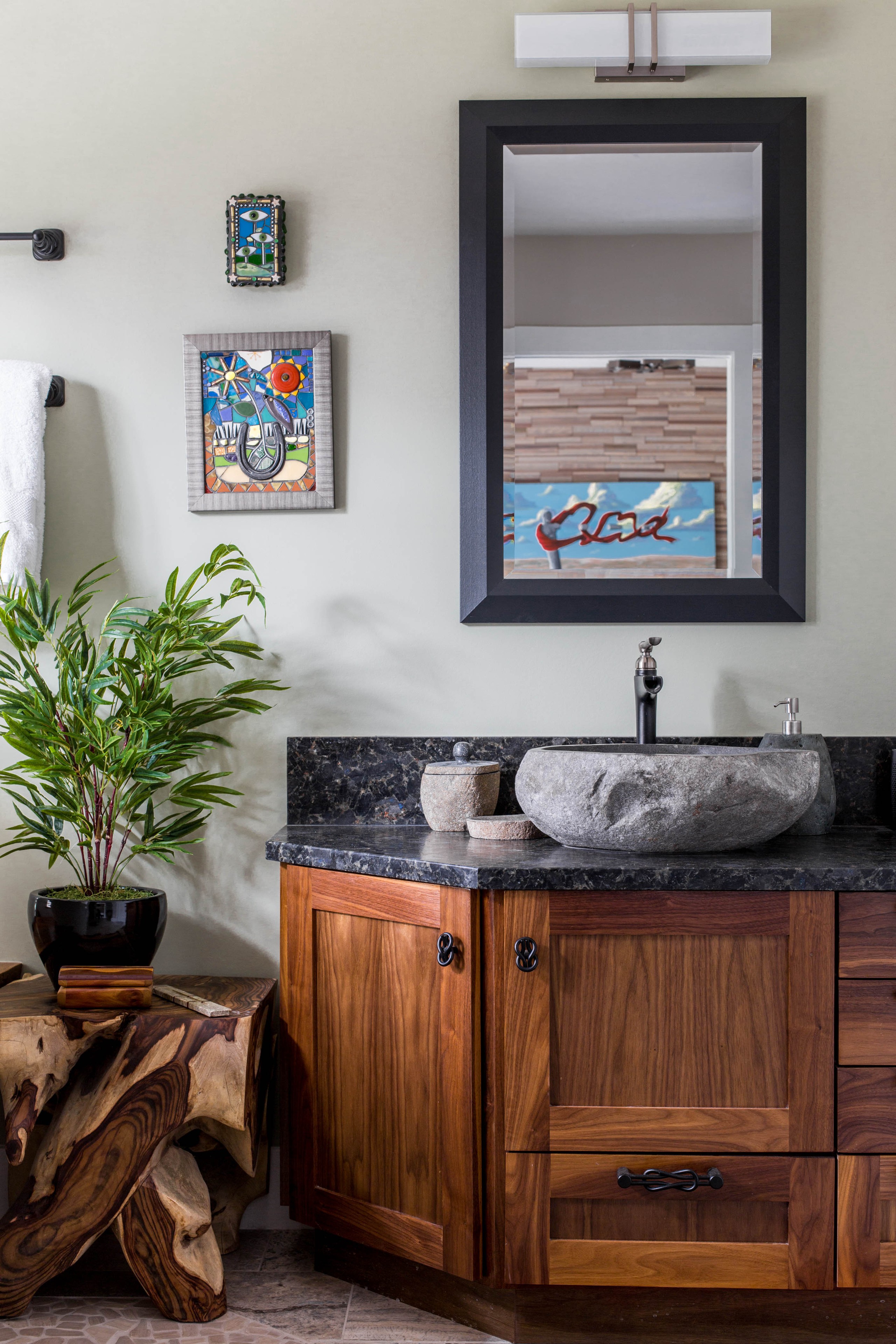 Bathrooms usually feature a lot of crisp materials that, while waterproof, are sometimes a little visually cold. Natural materials reintroduce some warmth and a sense of human touch, so look for places to add wood, organically shaped stone or woven baskets.