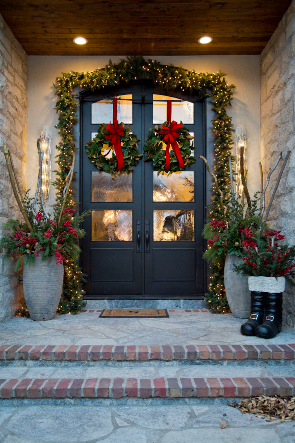 This front porch in Kansas — done up with festive garlands, strings of lights and a planter shaped like Santa’s boots — looks lavishly festive without being overwhelming.