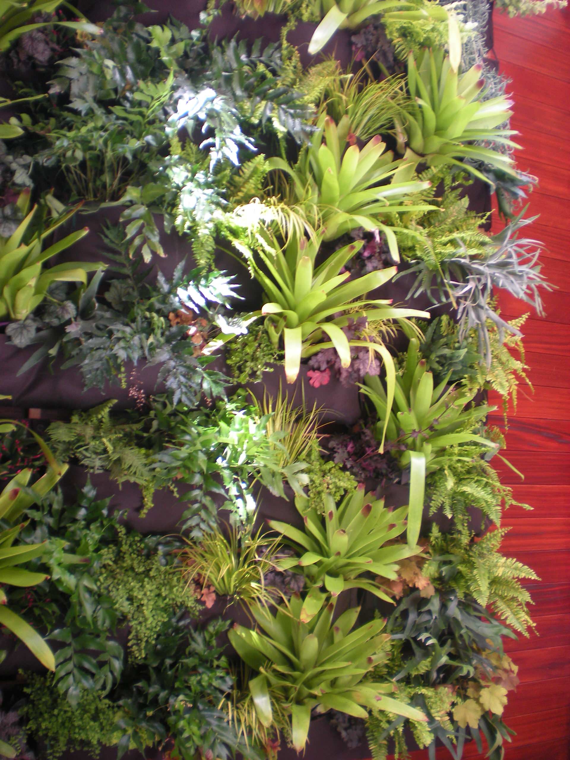 A closeup view of an installation similar to the previous one shows the variety of plants. The colors, the leaf shapes, and the leaf sizes give the wall its character.