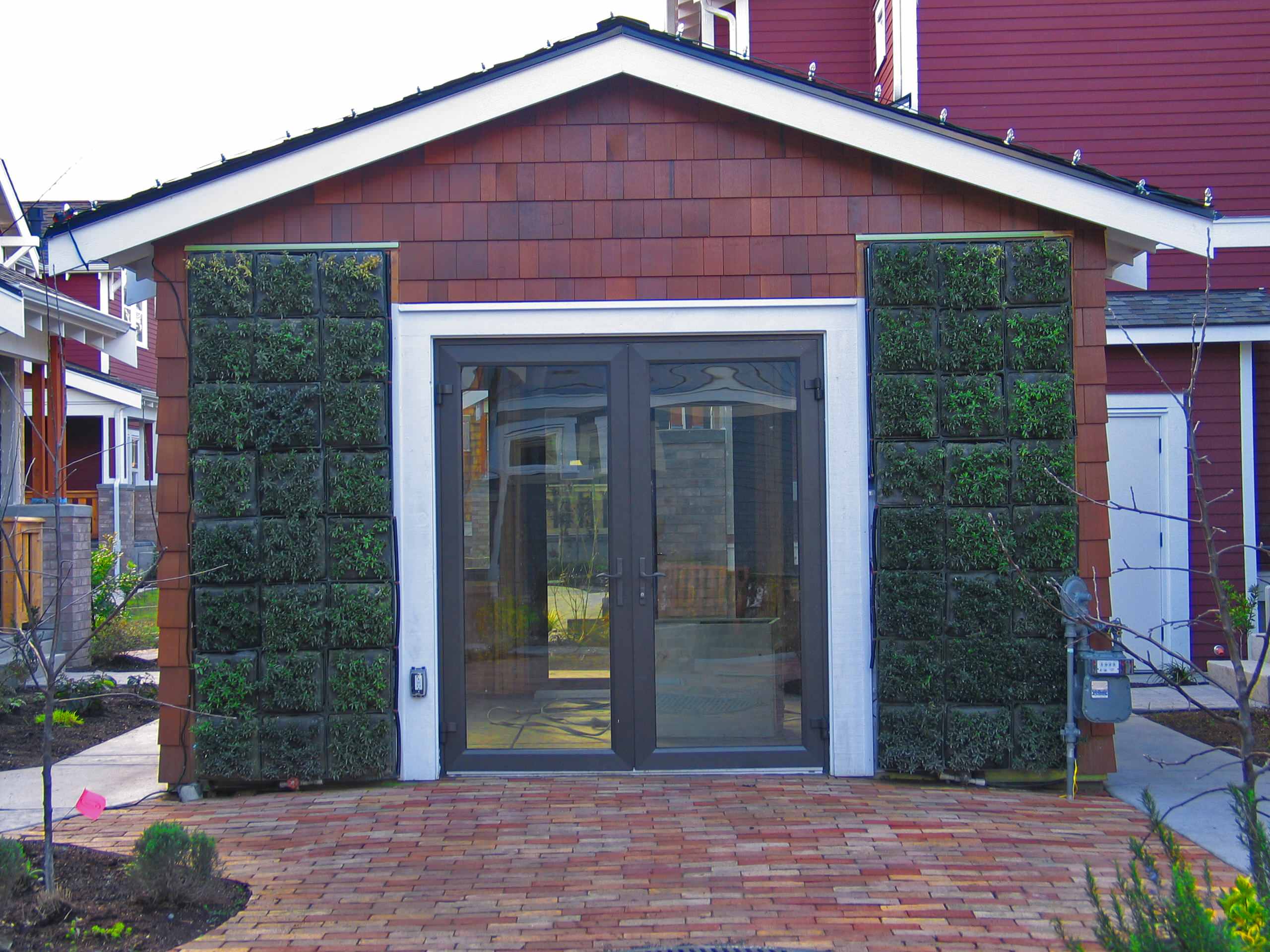 This living wall clearly expresses the depth required for the soil — what looks to be about six inches — in the way the U-shaped configuration of panels is expressed in front of the corrugated siding. Generally the panels that are used for living walls feature smaller trays with angled openings that give the plantings some verticality. To to put it another way, the plants don't cantilever horizontally from the panel, they reach up and out from the angled trays. Here, the wrapping of the window is a nice touch.