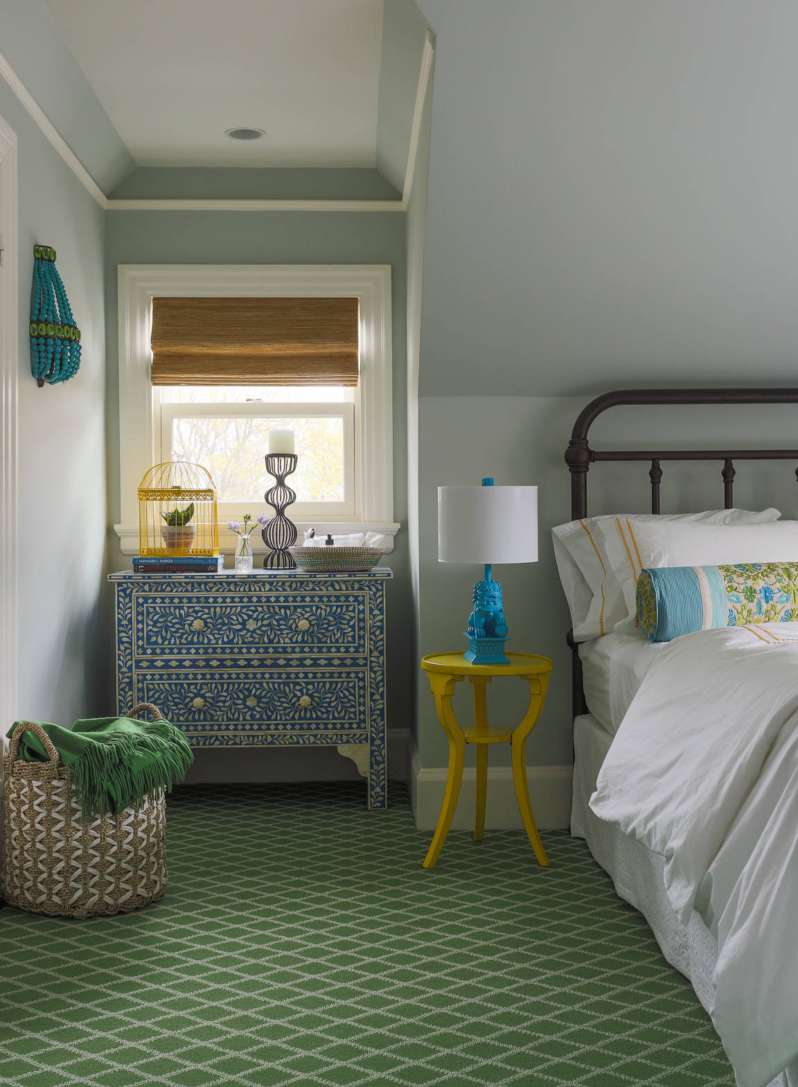 Chest: Butler Specialty Co.; wall paint: Cool Breeze, Benjamin Moore; carpet: Delmar in Iris Green, Prestige Mills; bed: Pottery Barn