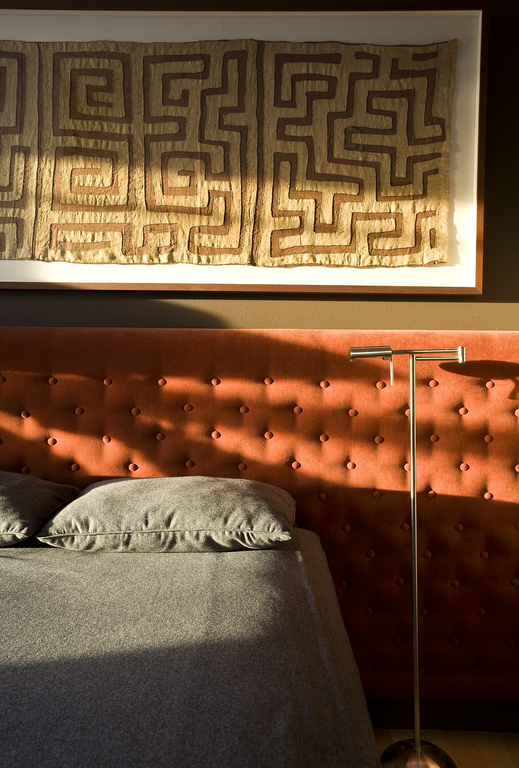 Bored with your headboard? Update it by covering it with a variety of fabric samples. In this example, the designer attached the samples with decorative tacks.