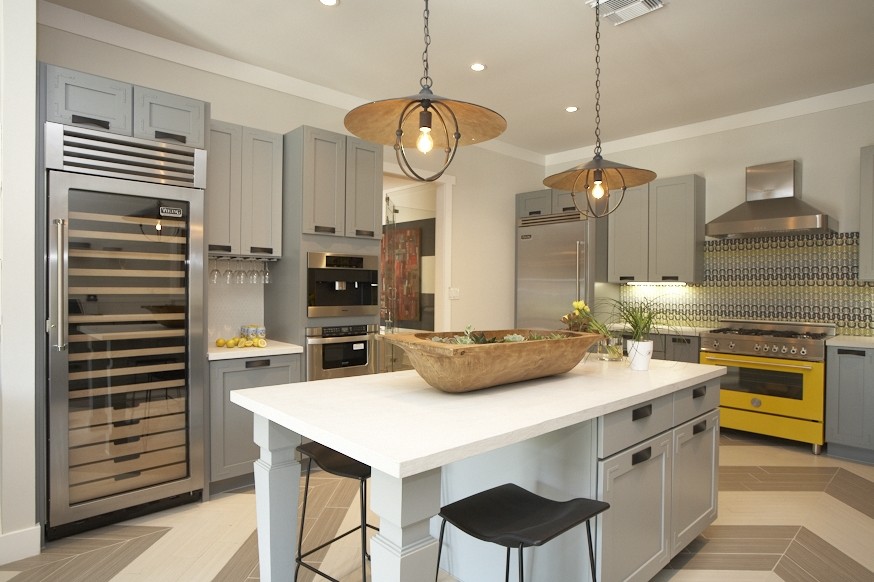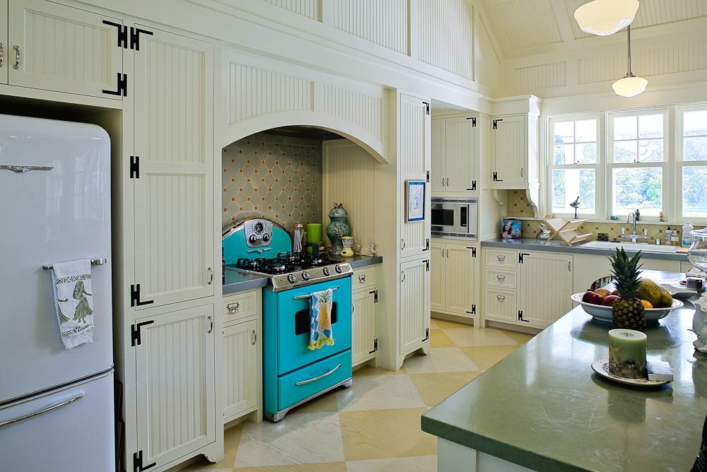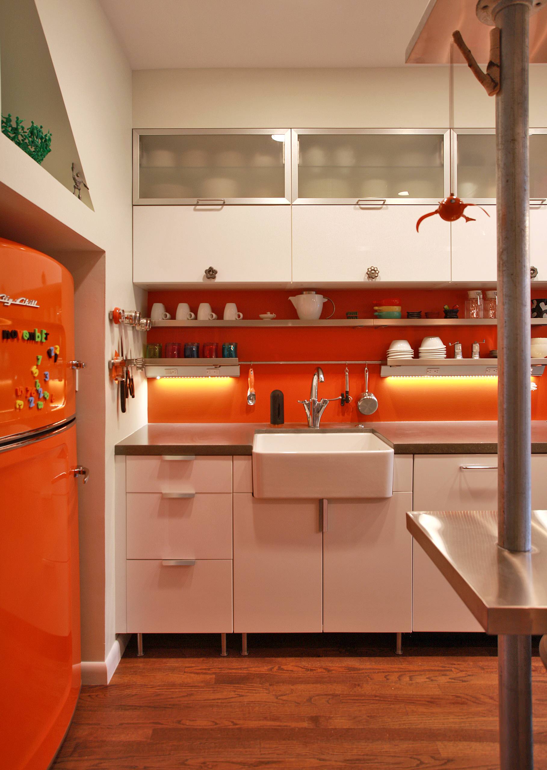 Zing! A hot pink fridge by Big Chill was really the only proper choice for this color-loving room.