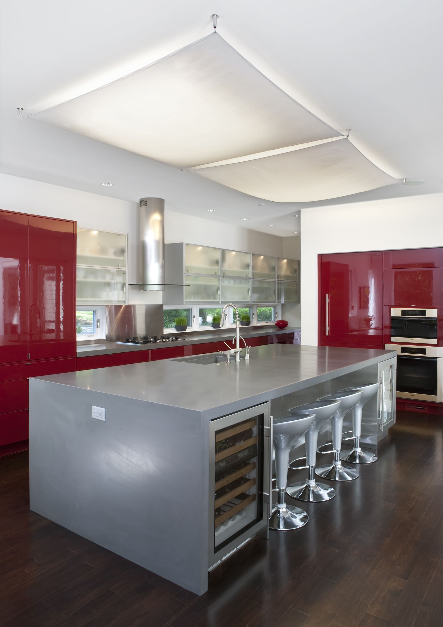 A dark, glossy red fridge. Covering built-in refrigerators with custom cabinet paneling is a great way to hide them or make them pop with color.