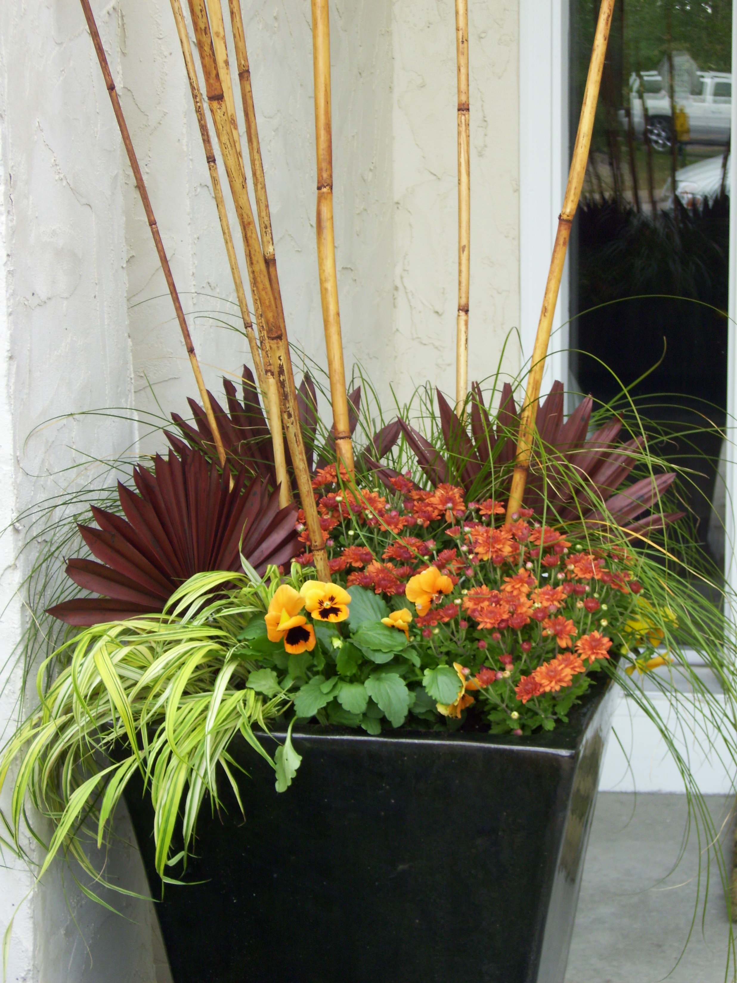 In this simple yet sophisticated fall container by Barrett Lawn Care, preserved fan-shape leaves form a bronze backdrop for coppery bedding mums (Chrysanthemum sp.), gold pansies (Viola sp.) and chartreuse Japanese forest grass (Hakonechloa macra). Golden bamboo stakes add height to the arrangement and visually contrast the mounded, half-moon plant forms in the container.