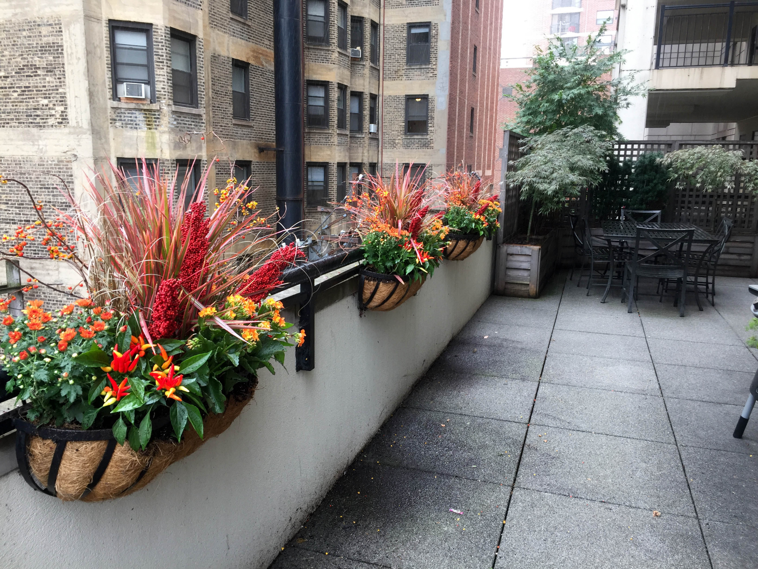 Ornamental peppers, Madagascar dragon tree (Dracaena marginata ‘Colorama’), preserved milo berries, bronze mums (Chrysanthemum sp.) and flowering kalanchoes adorn this Chicago balcony. “Artificial materials can be a great accent,” says Kathy Molnar Simpson, the designer of the planters; she added the milo berries for a stronger hit of red.