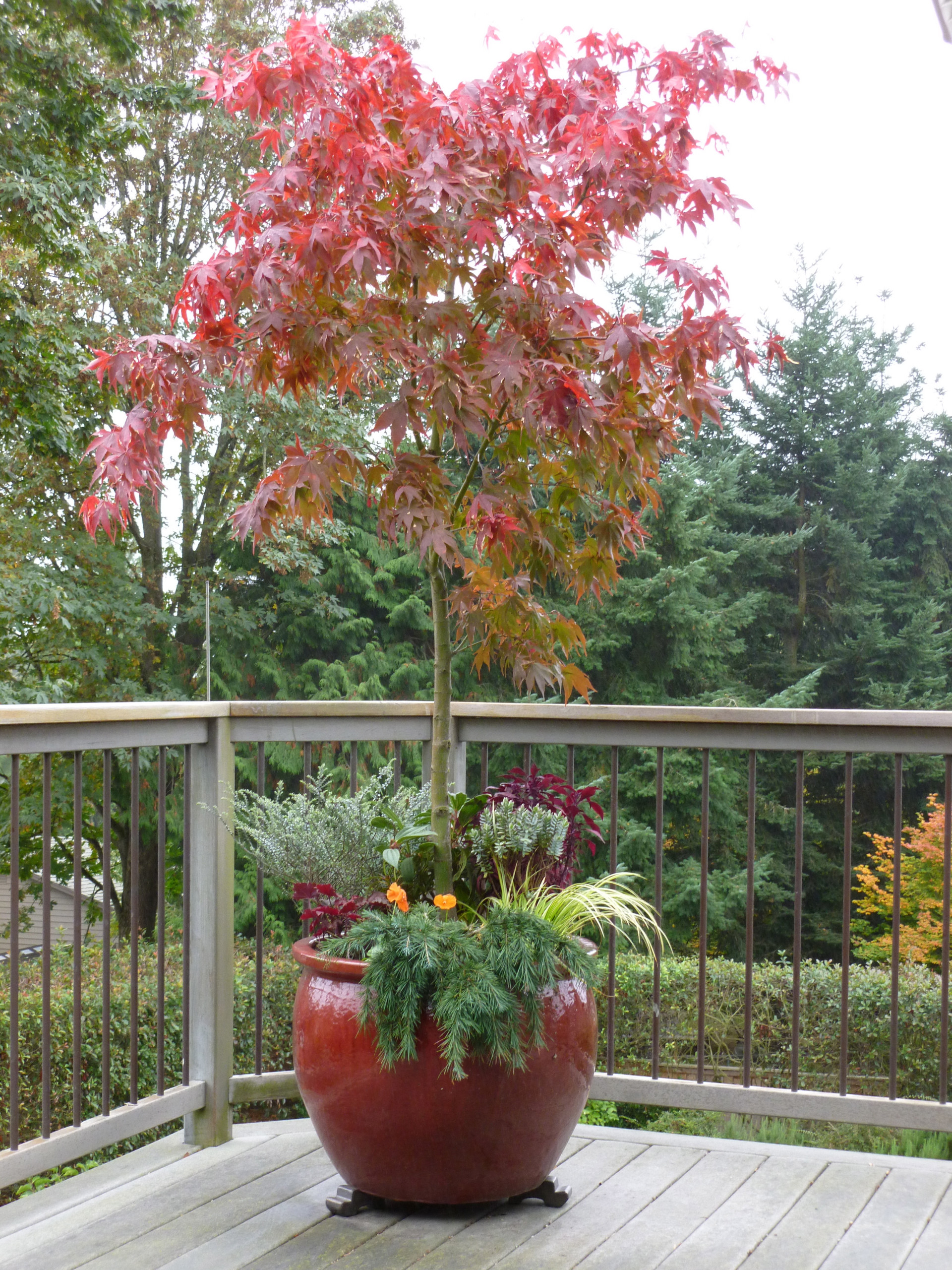 Landscape designer Hege Lie Watkins of Simply Garden Design describes this fall container, which sits on her patio in Kirkland, Washington, as a “happy mishmash.” Watkins used the bare soil at the base of the potted Japanese maple (Acer palmatum ‘Osakazuki’) as an opportunity to tuck in leftover plants.
