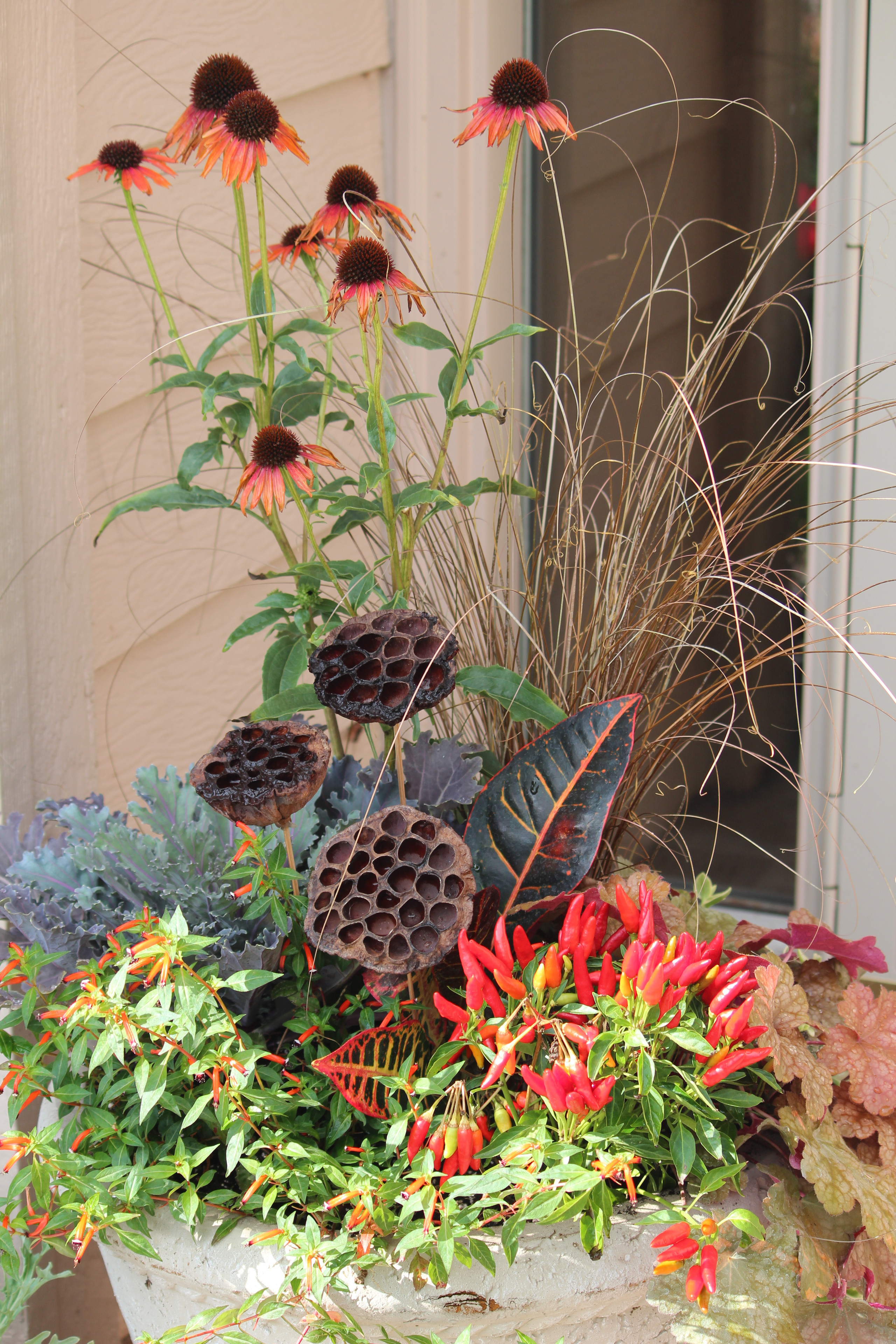 With feathery ‘Red Rooster’ sedge (Carex buchananii ‘Red Rooster’), chunky ornamental peppers, curly ‘Peacock Red’ kale (Brassica ‘Peacock Red’), ruffled ‘Marmalade’ coral bells (Heuchera ‘Marmalade’), glossy croton (Codiaeum variegatum) and graceful, sunset-hued coneflowers (Echinacea sp.), this entry arrangement is bursting with color and texture. As a bonus feature, designer Stephanie Town of Garden Stories stuck a few stems of preserved lotus pods into the center of the arrangement.