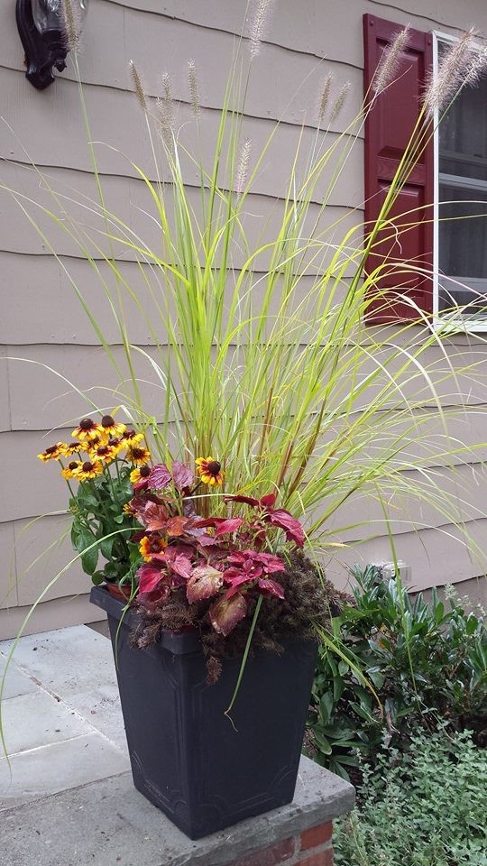 Adding one standout ingredient — sometimes called a “thriller” in container design — can really take a potted garden to the next level. Here, landscape designer Tina M. Yotka used feather reed grass (Calamagrostis x acutiflora ‘Karl Foerster’) to create a fireworks-like display for a doorstep container. Pairing the pale, exuberant ornamental grass with burgundy coleus, red stonecrop (Sedum sp.) and sunset-colored coneflowers (Echinacea sp.) makes for a stunning container design.