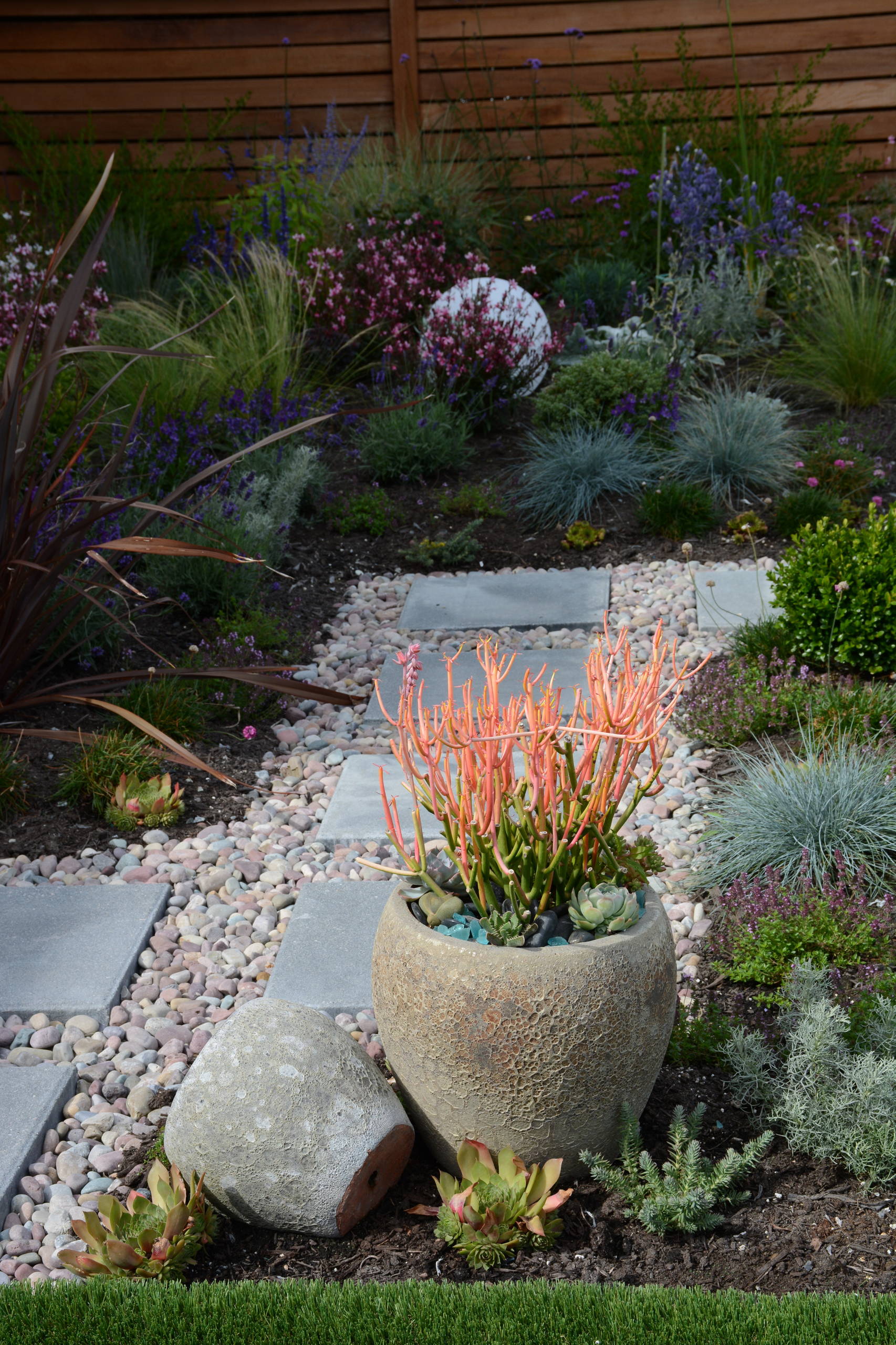 In desert and low-water gardens, look to hot-colored cactuses and succulents and drought-tolerant ornamental grasses to add fall flair to container gardens. Here, designer Glenna Partridge used milk bush (Euphorbia tirucalli ‘Sticks on Fire’) in a neutral container to act as a bright punctuation mark along a garden pathway.