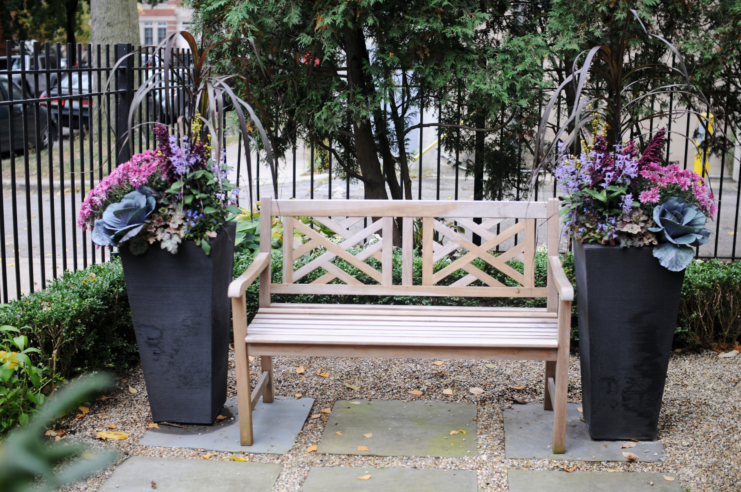 Proving that you don’t need to rely on reds and golds to have an arrangement feel like fall, these seductive dark designs by Kathy Molnar Simpson of KMS Gardens and Design stand out with their cool color palette. “Interesting and unusual color combos will still read fall as long as the majority of elements are fall materials,” Simpson says. “The colors in the majority of elements should have some relationship to each other. I think complementary combinations, rather than opposite color combos, tend to work better in fall.”