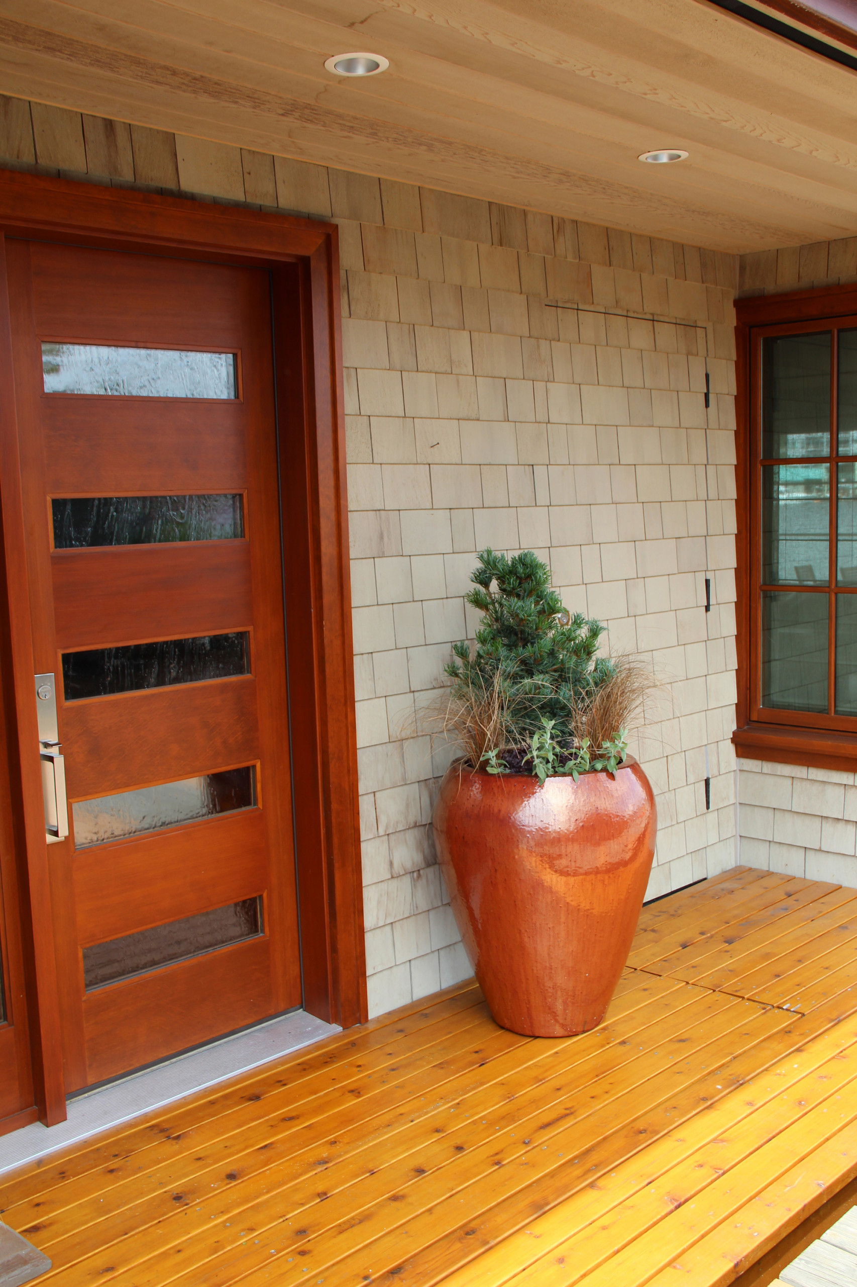 A potted conifer paired with wiry ornamental grasses looks handsome in a bronze pot at a contemporary-style entrance in the Pacific Northwest. Landscape designer Tish Treherne of Bliss Garden Design selected both the glazed ceramic container and the complementary blue-green and bronze plantings to tie in with the rich wood tones of the home’s front door.
