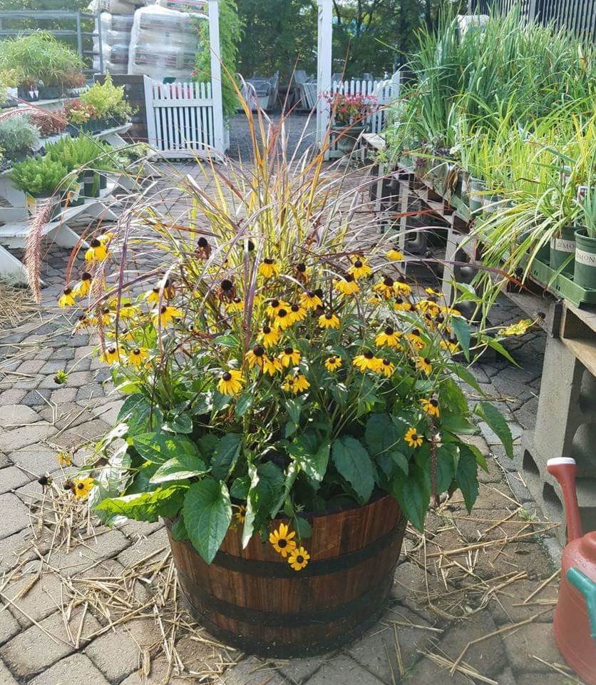 Landscape designer Tina M. Yotka put together this fall display while working at a local nursery. The simple combination of commonly available purple fountain grass (Pennisetum setaceum ‘Rubrum’) and black-eyed Susans (Rudbeckia hirta) planted densely in a half barrel captures the feeling of a fall meadow.