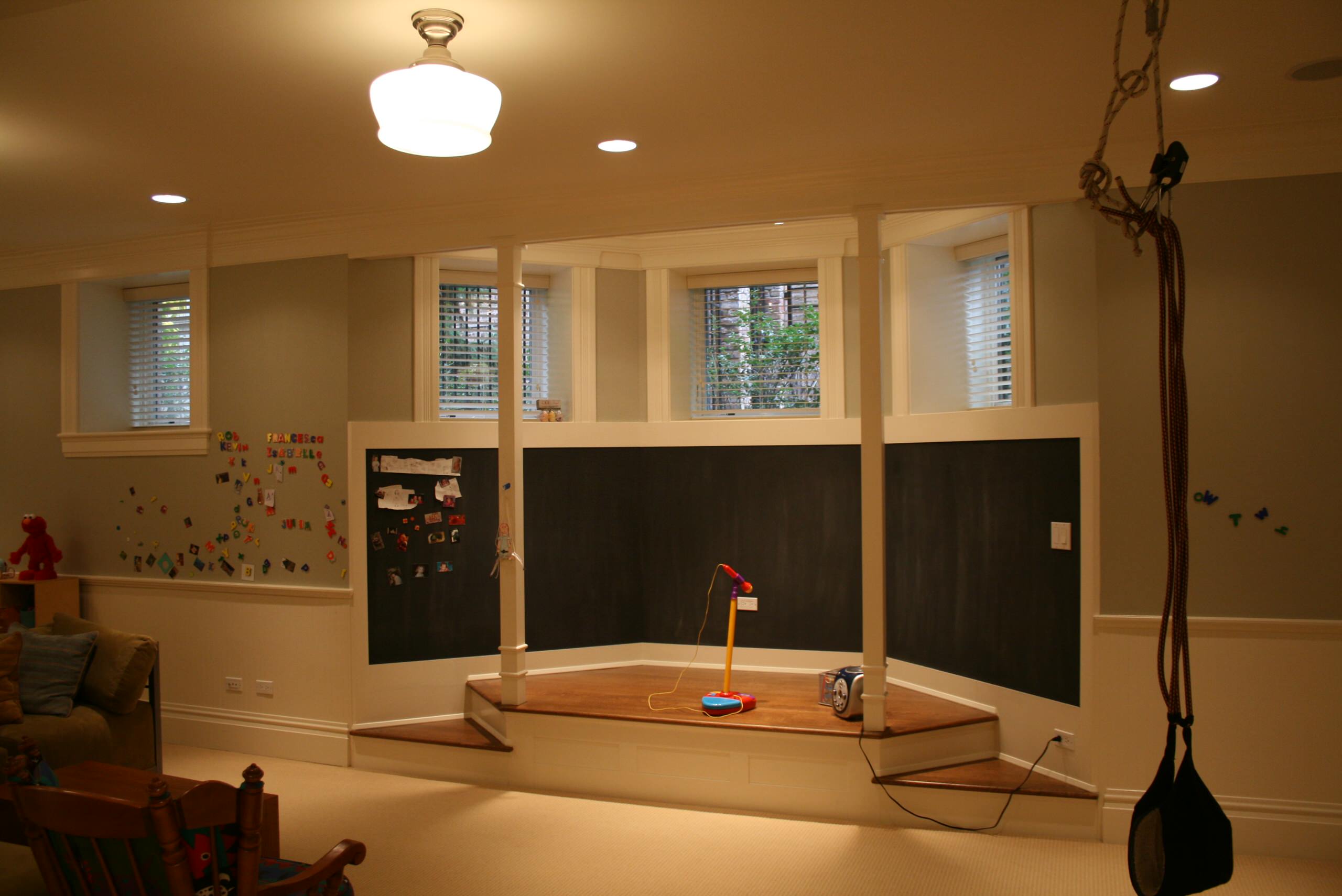 Turn a bay window into a stage. Here the magnetic and chalkboard walls let kids personalize performances with drawings or concert signs.