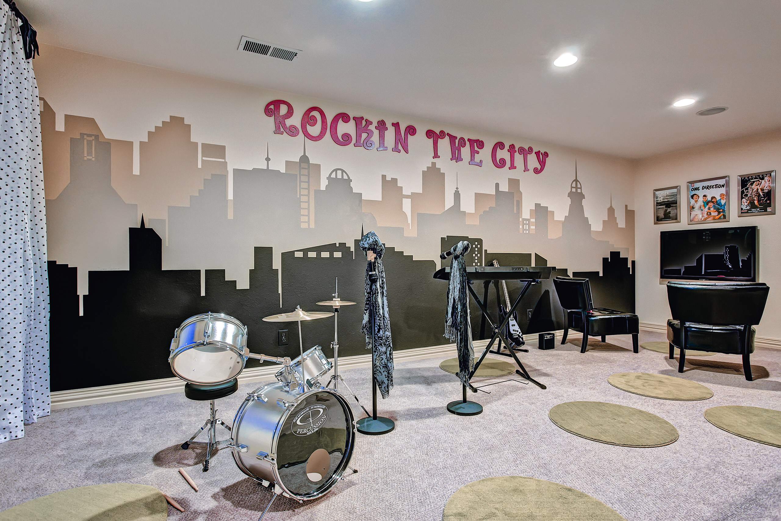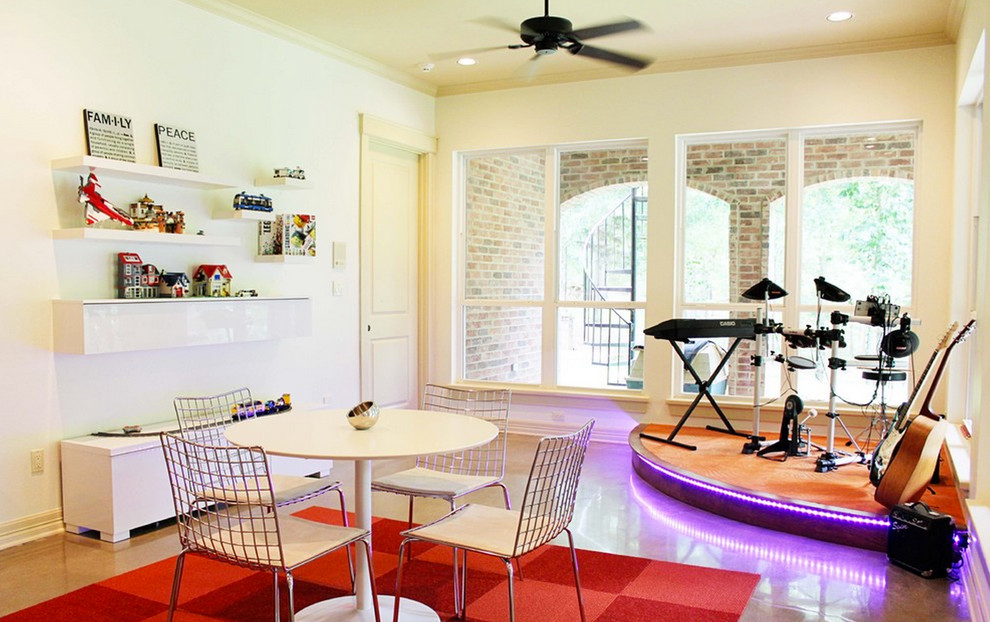Make sure those guitar or drum lessons are paying off by letting your kids strut their stuff. This music room–playroom combo leaves plenty of space for adoring fans and works for homework time, too.