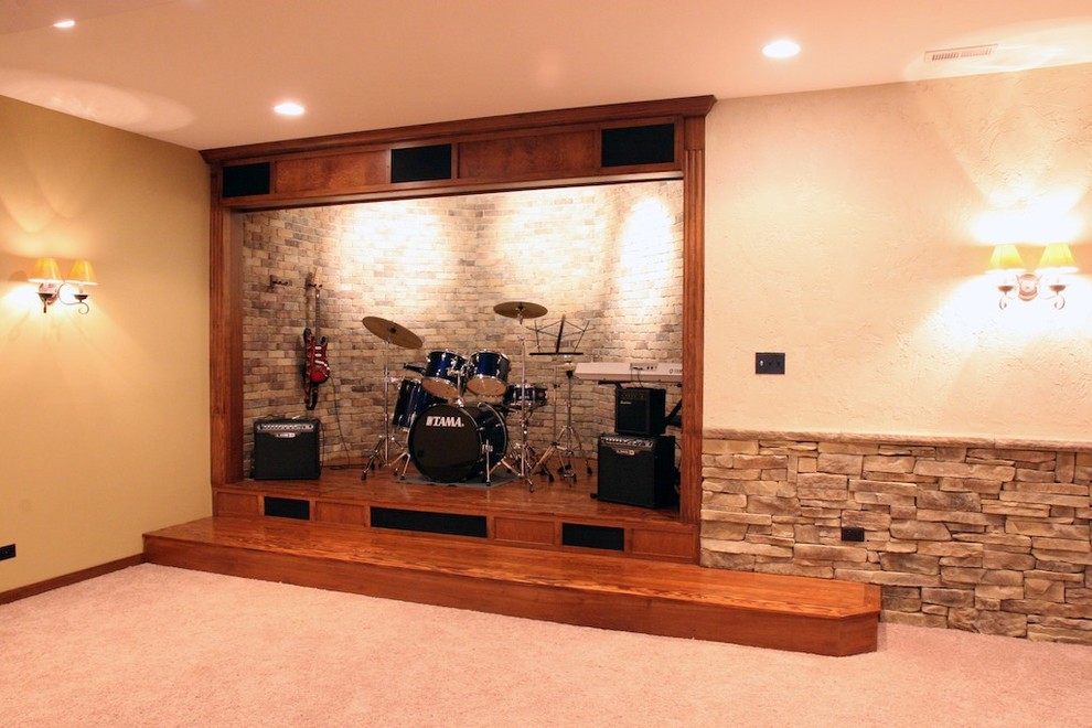 Though not raised, this wood-laden space is perfect for putting on a show. The wide-open area has plenty of room for dancing and performing, while the built-in cabinets can store instruments and other equipment.