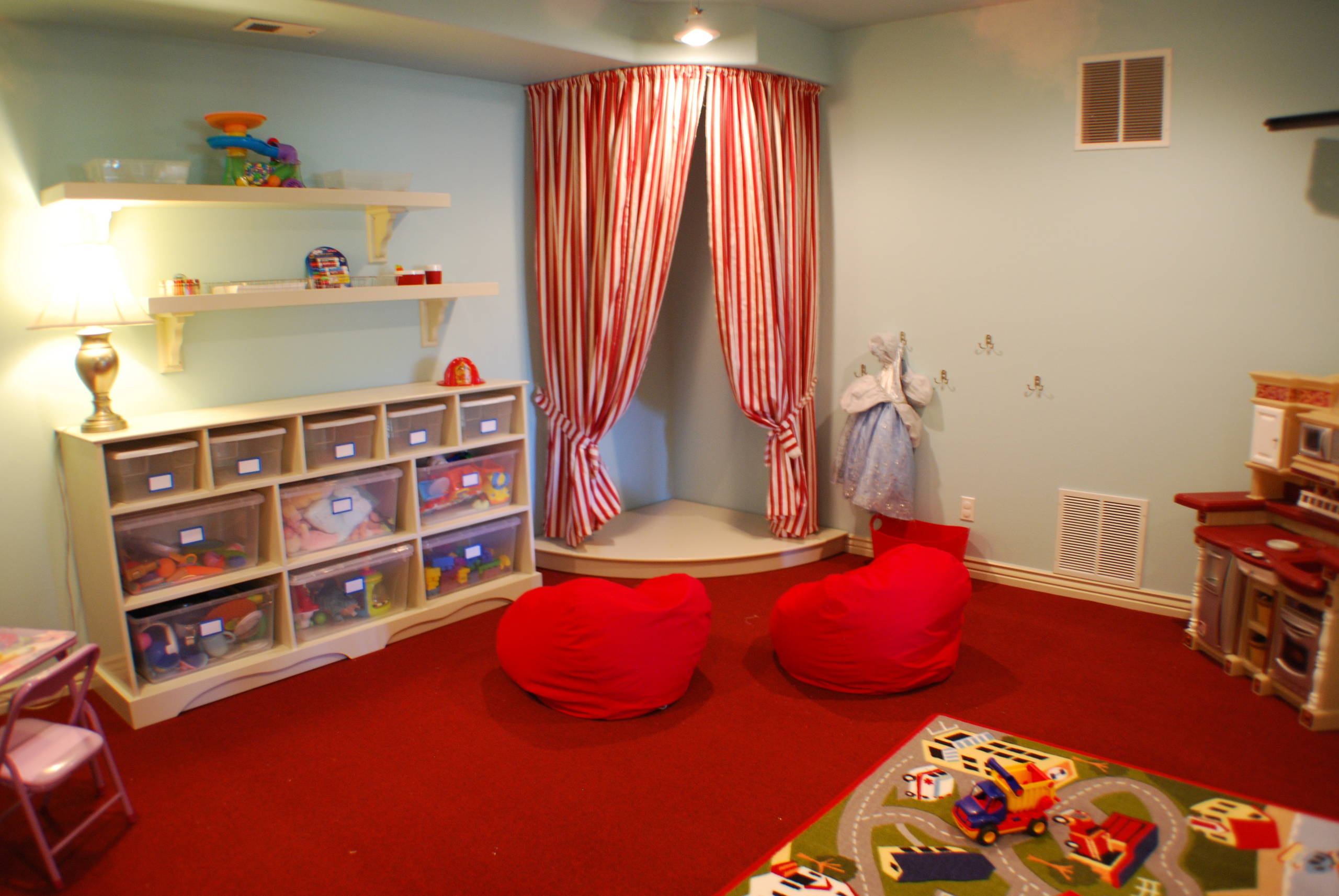 Complete with beanbags and red striped curtains, this fun little stage has plenty of room for kid-friendly entertaining. The nearby toy storage can also be used for play props and dress-up clothes.